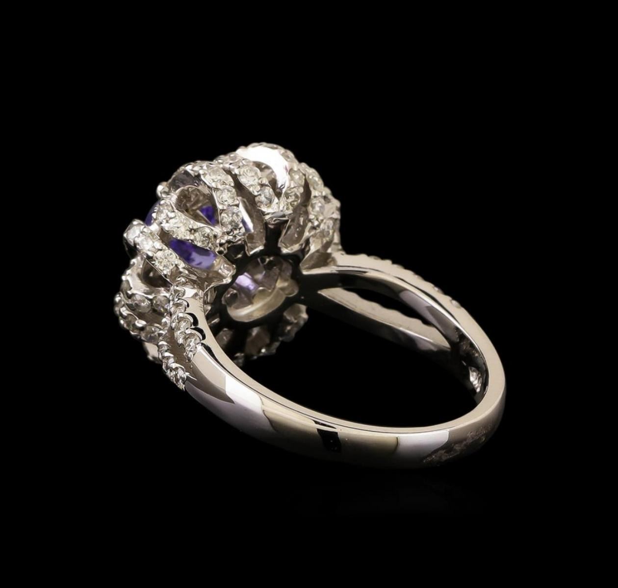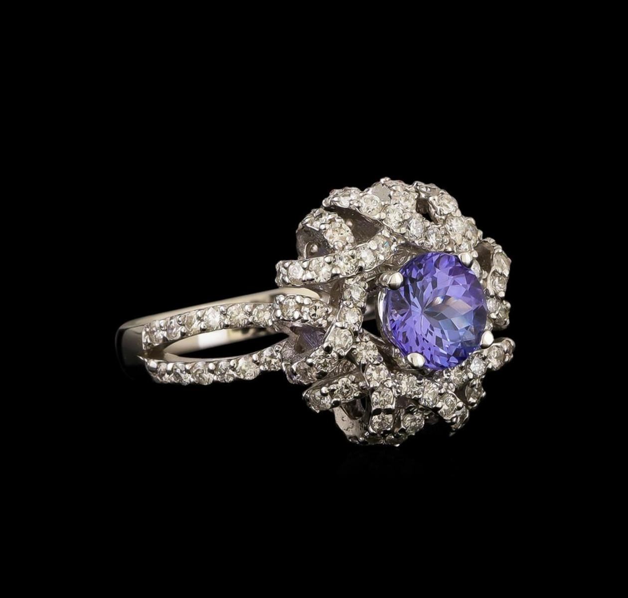 One electronically tested 14KT white gold ladies cast tanzanite and diamond ring with a bright polish finish. Identified with markings of "K14". Condition is new. Containing: One prong set round modified brilliant cut natural tanzanite, measuring 6.45 - 6.41 x 4.18 mm, approximate weight of 1.17ct., clarity is eye clean, type I, medium light, very slightly grayish, violet color, (GIA V 4/3), cut is good. Fifty-Six prong set round brilliant cut diamonds, measuring 1.30 - 1.30 x 0.78mm (depth est.) approximate total weight of 56 Stones = 0.45ct. Clarity: SI-2 to I-1. Color: H - I, Cut is Good. Colored gemstones are presumed to have been subjected to commonly used enhancement processes. All diamonds and colored gemstones are graded in the mounting, unless otherwise stated. Total Weight of Colored Stones 1.17ct. Total Weight of Diamonds 0.45ct. Total Weight of Ring 5.80 grams. GGL Appraised.