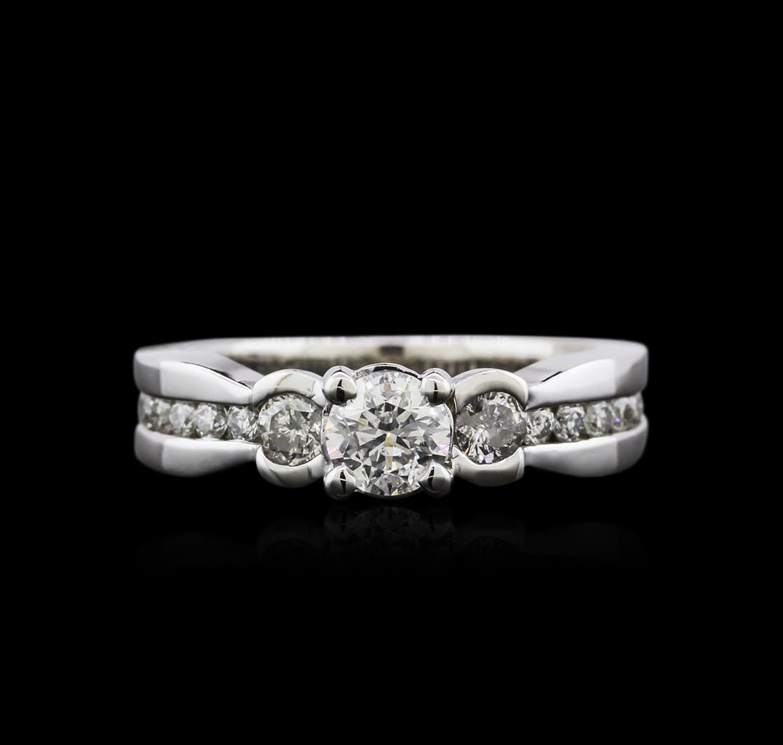 One electronically tested 14KT white gold ladies cast diamond ring with a bright polish finish. Identified with markings of "14K". Condition is new. Containing: One prong set round brilliant cut diamond, measuring 5.20 - 5.20 x 3.12mm (depth est.) approximate weight of 0.57ct. Clarity: I-1. Color: I, Cut is Good. Two half bezel set round brilliant cut diamonds, measuring 3.00 - 3.00 x 1.80mm (depth est.) approximate total weight of 2 Stones = 0.27ct. Clarity: I-1 to I-2. Color: I - J, Cut is Good. Fourteen prong set round brilliant cut diamonds, measuring 1.90 - 1.90 x 1.14mm (depth est.) approximate total weight of 14 Stones = 0.35ct. Clarity: I-1 to I-2. Color: I - J, Cut is Good. Diamonds are graded in the mounting, unless otherwise stated. Total Weight of Diamonds 1.19ct. Total Weight of Ring 6.70 grams. GGL Appraised at $4,140.00.