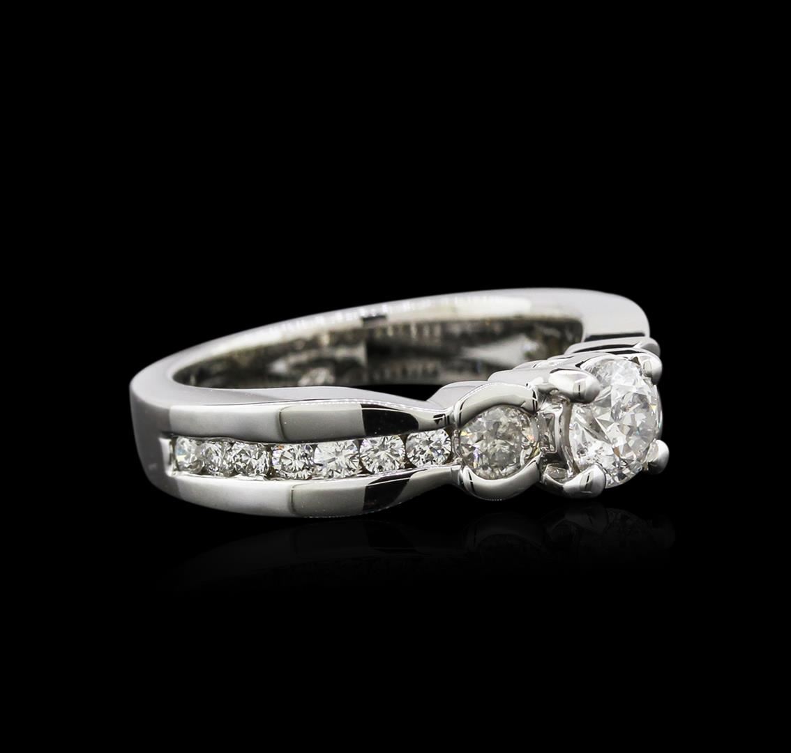One electronically tested 14KT white gold ladies cast diamond ring with a bright polish finish. Identified with markings of "14K". Condition is new. Containing: One prong set round brilliant cut diamond, measuring 5.20 - 5.20 x 3.12mm (depth est.) approximate weight of 0.57ct. Clarity: I-1. Color: I, Cut is Good. Two half bezel set round brilliant cut diamonds, measuring 3.00 - 3.00 x 1.80mm (depth est.) approximate total weight of 2 Stones = 0.27ct. Clarity: I-1 to I-2. Color: I - J, Cut is Good. Fourteen prong set round brilliant cut diamonds, measuring 1.90 - 1.90 x 1.14mm (depth est.) approximate total weight of 14 Stones = 0.35ct. Clarity: I-1 to I-2. Color: I - J, Cut is Good. Diamonds are graded in the mounting, unless otherwise stated. Total Weight of Diamonds 1.19ct. Total Weight of Ring 6.70 grams. GGL Appraised at $4,140.00.