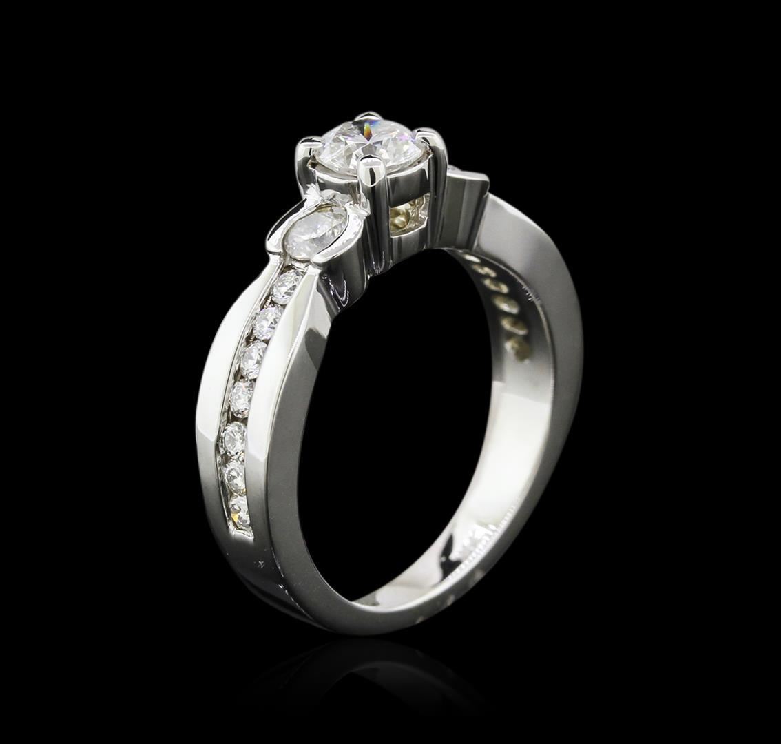 One electronically tested 14KT white gold ladies cast diamond ring with a bright polish finish. Identified with markings of "14K". Condition is new. Containing: One prong set round brilliant cut diamond, measuring 5.20 - 5.20 x 3.12mm (depth est.) approximate weight of 0.57ct. Clarity: I-1. Color: I, Cut is Good. Two half bezel set round brilliant cut diamonds, measuring 3.00 - 3.00 x 1.80mm (depth est.) approximate total weight of 2 Stones = 0.27ct. Clarity: I-1 to I-2. Color: I - J, Cut is Good. Fourteen prong set round brilliant cut diamonds, measuring 1.90 - 1.90 x 1.14mm (depth est.) approximate total weight of 14 Stones = 0.35ct. Clarity: I-1 to I-2. Color: I - J, Cut is Good. Diamonds are graded in the mounting, unless otherwise stated. Total Weight of Diamonds 1.19ct. Total Weight of Ring 6.70 grams. GGL Appraised.