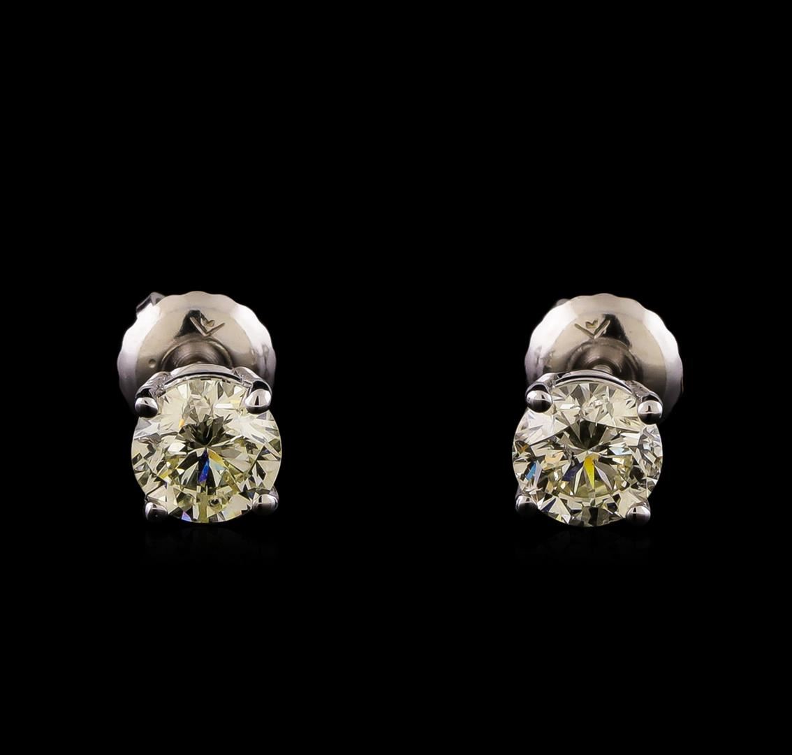 One electronically tested 14KT white gold cast & assembled diamond solitaire earrings with screw backs. Bright polish finish. Condition is new, good workmanship. Containing: One prong set round brilliant cut diamond, measuring 5.01 - 5.00 x 3.15mm (depth est.), 4.00% GTCF approximate weight of 0.60ct with a medium blue fluorescence. Graded in the setting. Clarity: I-1. Depth: 62.9%. Table 57.9%. One prong set round brilliant cut diamond, measuring 4.90 - 4.80 x 3.30mm (depth est.), 4.00% GTCF approximate weight of 0.59ct. Graded in the setting. Clarity: I-1. Depth: 68.0%. Table 63.9%. Total Weight of Diamonds 1.19ct. Total Weight of Earrings 0.95 grams. AIG Appraised at $3,965.00.