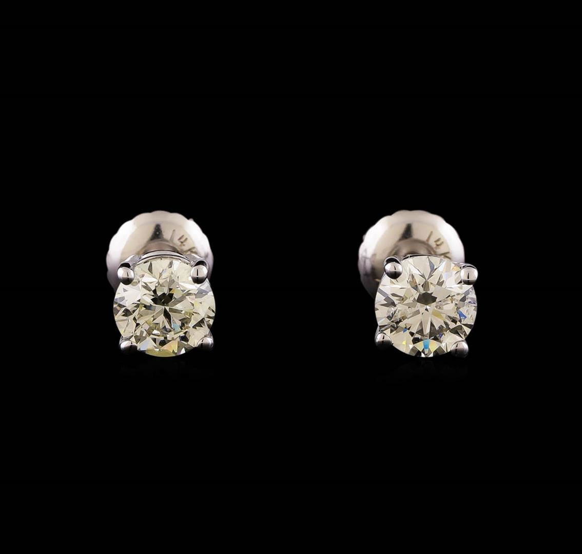 One pair electronically tested 14KT white gold cast & assembled diamond solitaire earrings with screw backs. Bright polish finish. Condition is new, good workmanship. Containing: One prong set round brilliant cut diamond, measuring 5.01 - 5.00 x 3.20mm (depth est.), 3.00% GTCF approximate weight of 0.60ct with a faint blue fluorescence. Graded in the setting. Clarity: I-1. Color: 63.9%. Table 59.9%. One prong set round brilliant cut diamond, measuring 5.00 - 4.90 x 3.20mm (depth est.), 3.00% GTCF approximate weight of 0.59ct with a medium blue fluorescence. Graded in the setting. Clarity: I-1. Color: 64.7%. Table 60.6%. Total Weight of Diamonds 1.19ct. Total Weight of Earrings 0.95 grams. AIG Appraised at $4,265.00. AIG Appraised at $4,265.00.
