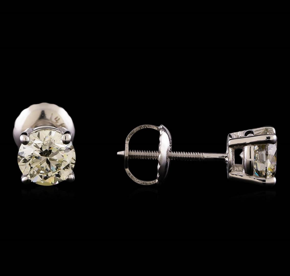 One pair electronically tested 14KT white gold cast & assembled diamond solitaire earrings with screw backs. Bright polish finish. Condition is new, good workmanship. Containing: One prong set round brilliant cut diamond, measuring 5.01 - 5.00 x 3.20mm (depth est.), 3.00% GTCF approximate weight of 0.60ct with a faint blue fluorescence. Graded in the setting. Clarity: I-1. Color: 63.9%. Table 59.9%. One prong set round brilliant cut diamond, measuring 5.00 - 4.90 x 3.20mm (depth est.), 3.00% GTCF approximate weight of 0.59ct with a medium blue fluorescence. Graded in the setting. Clarity: I-1. Color: 64.7%. Table 60.6%. Total Weight of Diamonds 1.19ct. Total Weight of Earrings 0.95 grams. AIG Appraised at $4,265.00. AIG Appraised at $4,265.00.