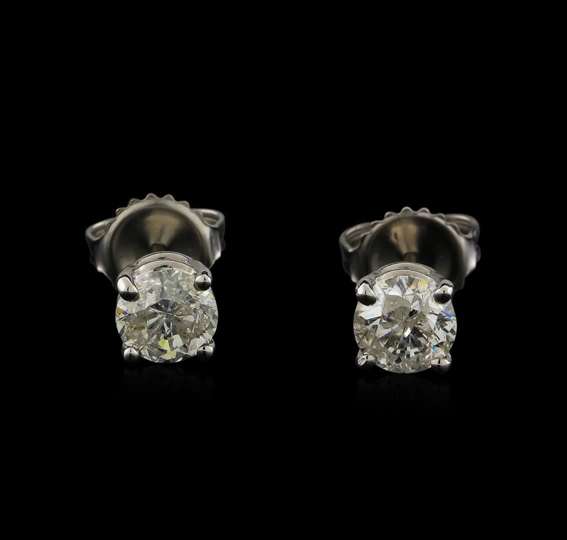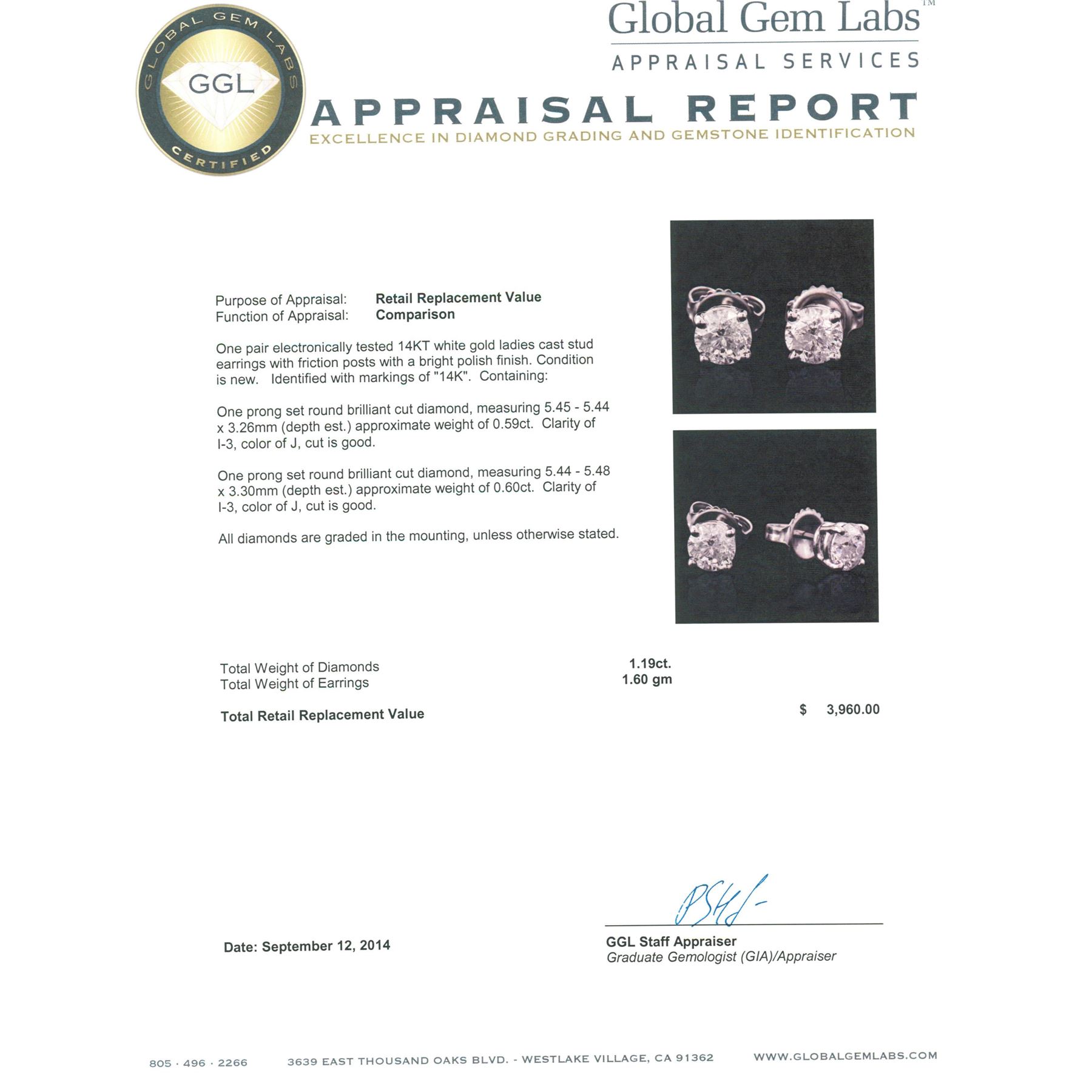 One pair electronically tested 14KT white gold ladies cast stud earrings with friction posts with a bright polish finish. Identified with markings of "14K". Condition is new. Containing: One prong set round brilliant cut diamond, measuring 5.45 - 5.44 x 3.26mm (depth est.) approximate weight of 0.59ct. Clarity: I-3. Color: J, Cut is Good. One prong set round brilliant cut diamond, measuring 5.44 - 5.48 x 3.30mm (depth est.) approximate weight of 0.60ct. Clarity: I-3. Color: J, Cut is Good. All diamonds are graded in the mounting, unless otherwise stated total weight of Diamonds 1.19ct. Total Weight of Earrings 1.60 grams. GGL Appraised at $3,960.00.