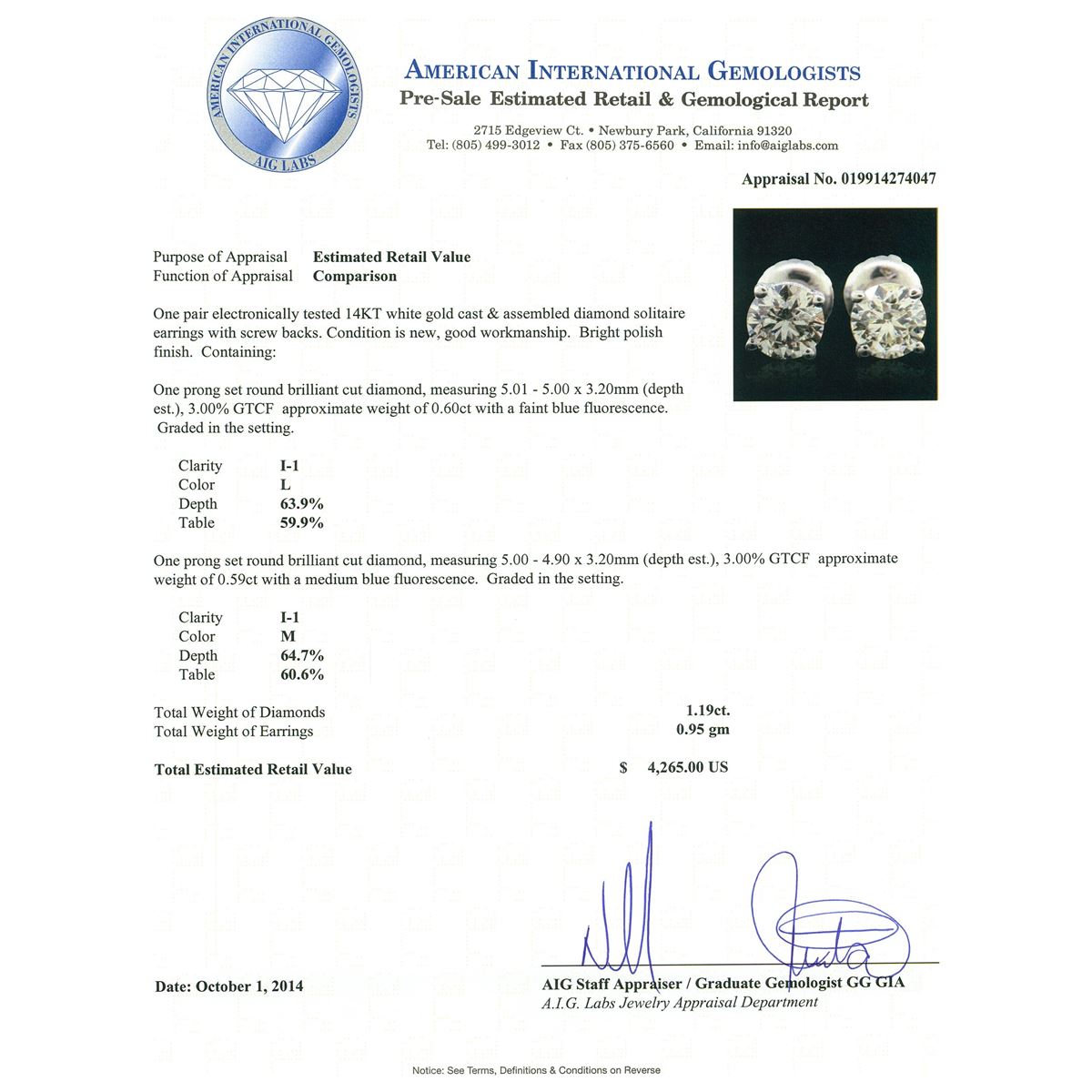 One pair electronically tested 14KT white gold cast & assembled diamond solitaire earrings with screw backs. Bright polish finish. Condition is new, good workmanship. Containing: One prong set round brilliant cut diamond, measuring 5.01 - 5.00 x 3.20mm (depth est.), 3.00% GTCF approximate weight of 0.60ct with a faint blue fluorescence. Graded in the setting. Clarity: I-1. Color: 63.9%. Table 59.9%. One prong set round brilliant cut diamond, measuring 5.00 - 4.90 x 3.20mm (depth est.), 3.00% GTCF approximate weight of 0.59ct with a medium blue fluorescence. Graded in the setting. Clarity: I-1. Color: 64.7%. Table 60.6%. Total Weight of Diamonds 1.19ct. Total Weight of Earrings 0.95 grams. AIG Appraised at $4,265.00.