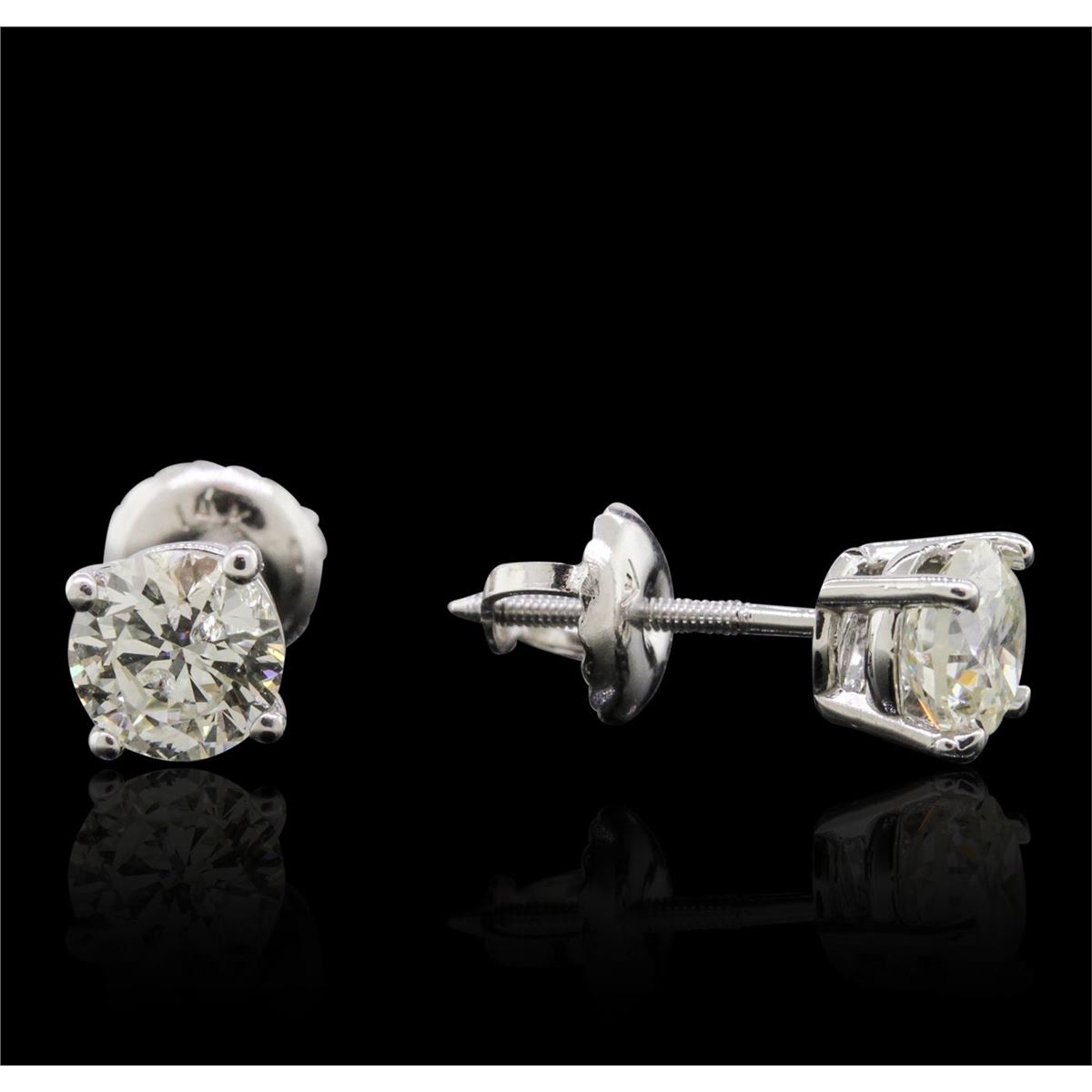 One electronically tested 14KT white gold cast & assembled diamond solitaire earrings with screw backs. Bright polish finish. Condition is new, good workmanship. Containing: One prong set round brilliant cut diamond, measuring 5.01 - 5.00 x 3.15mm (depth est.), 4.00% GTCF approximate weight of 0.60ct with a medium blue fluorescence. Graded in the setting. Clarity: I-1. Depth: 62.9%. Table 57.9%. One prong set round brilliant cut diamond, measuring 4.90 - 4.80 x 3.30mm (depth est.), 4.00% GTCF approximate weight of 0.59ct. Graded in the setting. Clarity: I-1. Depth: 68.0%. Table 63.9%. Total Weight of Diamonds 1.19ct. Total Weight of Earrings 0.95 grams. AIG Appraised at $3,965.00.
