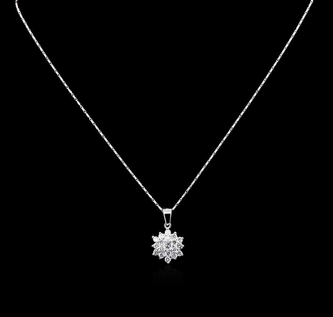 One electronically tested 14KT white gold ladies combination cast & assembled diamond pendant & chain 18.0" long, fancy link with a lobster claw clasp with a bright polish finish. Identified with markings of "14K". Condition is new. Containing: Eighteen prong set round brilliant cut diamonds, measuring 3.60 - 2.50 x 1.83mm (depth est.) approximate total weight of 18 Stones = 1.20ct. Clarity: SI-2 to I-1. Color: I - J, Cut is Good. All diamonds are graded in the mounting, unless otherwise stated. Total Weight of Diamonds 1.20ct. Total Weight of Pendant & Chain 7.20 grams. GGL Appraised at $4,475.00.