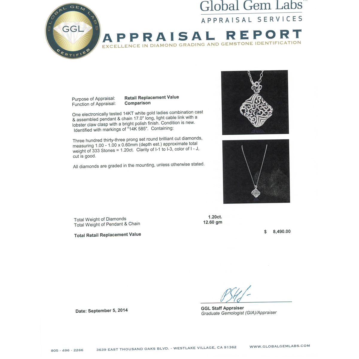 One electronically tested 14KT white gold ladies combination cast & assembled pendant & chain 17.0" long, light cable link with a lobster claw clasp with a bright polish finish. Identified with markings of "14K 585". Condition is new. Containing: Three Hundred Thirty-Three prong set round brilliant cut diamonds, measuring 1.00 - 1.00 x 0.60mm (depth est.) approximate total weight of 333 Stones = 1.20ct. Clarity: I-1 to I-3. Color: I - J, Cut is Good. All diamonds are graded in the mounting, unless otherwise stated. Total Weight of Diamonds 1.20ct. Total Weight of Pendant & Chain 12.60 grams. GGL Appraised at $8,490.00.
