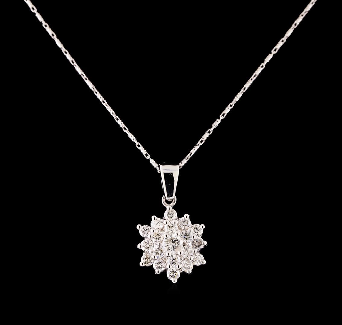 One electronically tested 14KT white gold ladies combination cast & assembled diamond pendant & chain 18.0" long, fancy link with a lobster claw clasp with a bright polish finish. Identified with markings of "14K". Condition is new. Containing: Eighteen prong set round brilliant cut diamonds, measuring 3.60 - 2.50 x 1.83mm (depth est.) approximate total weight of 18 Stones = 1.20ct. Clarity: SI-2 to I-1. Color: I - J, Cut is Good. All diamonds are graded in the mounting, unless otherwise stated. Total Weight of Diamonds 1.20ct. Total Weight of Pendant & Chain 7.20 grams. GGL Appraised.