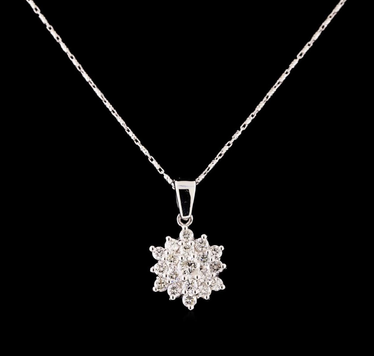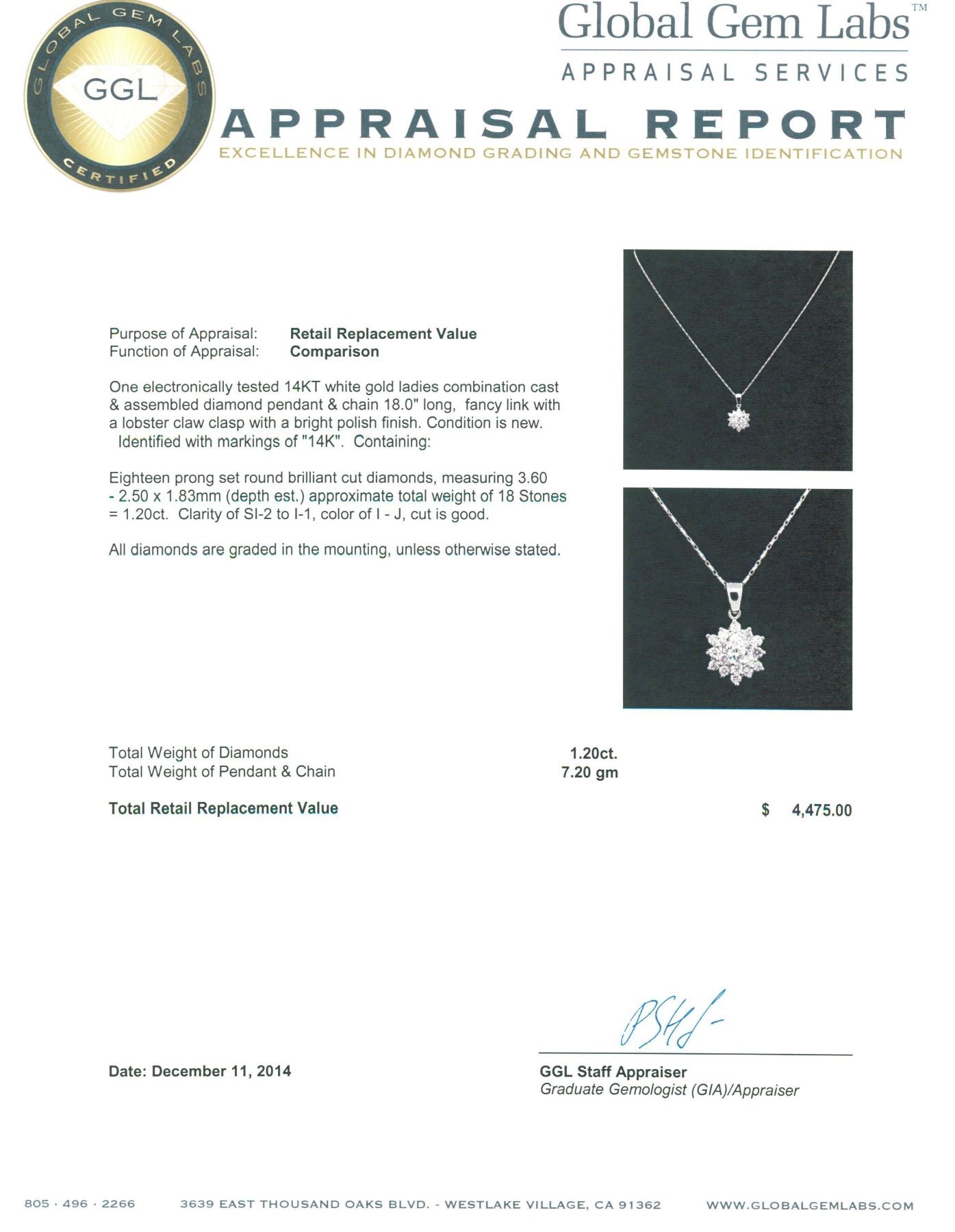 One electronically tested 14KT white gold ladies combination cast & assembled diamond pendant & chain 18.0" long, fancy link with a lobster claw clasp with a bright polish finish. Identified with markings of "14K". Condition is new. Containing: Eighteen prong set round brilliant cut diamonds, measuring 3.60 - 2.50 x 1.83mm (depth est.) approximate total weight of 18 Stones = 1.20 ct. Clarity: SI-2 to I-1. Color: I - J, Cut is Good. All diamonds are graded in the mounting, unless otherwise stated. Total Weight of Diamonds 1.20 ct. Total Weight of Pendant & Chain 7.20 grams. GGL Appraised.
