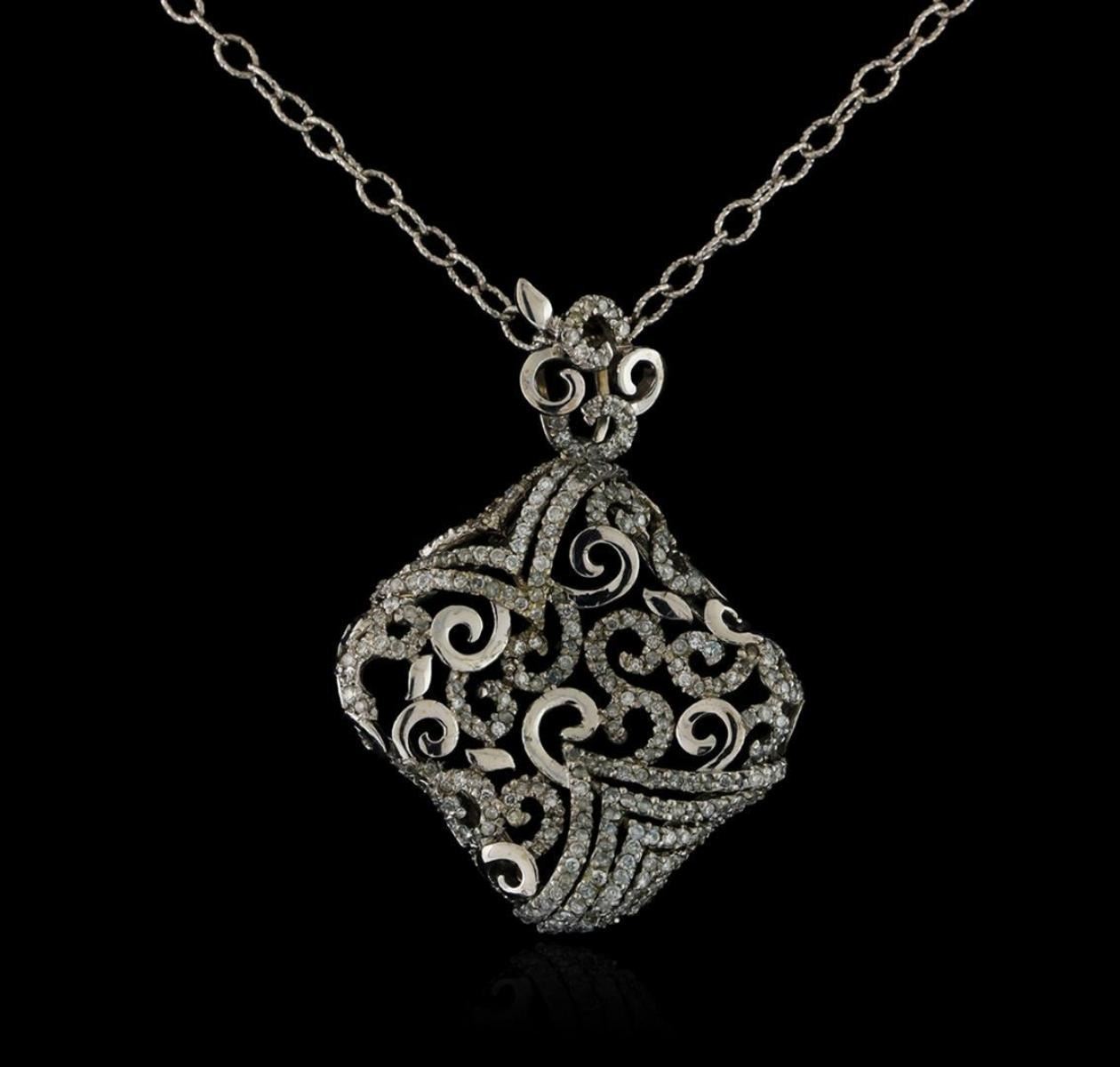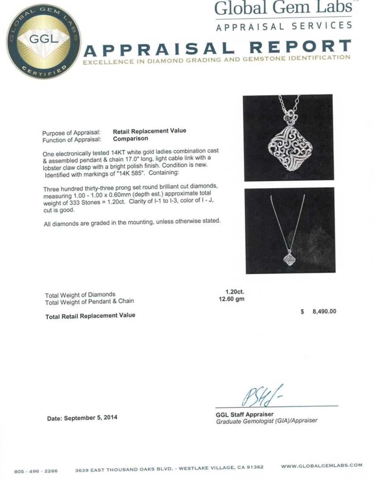 One electronically tested 14KT white gold ladies combination cast & assembled pendant & chain 17.0" long, light cable link with a lobster claw clasp with a bright polish finish. Identified with markings of "14K 585". Condition is new. Containing: Three Hundred Thirty-Three prong set round brilliant cut diamonds, measuring 1.00 - 1.00 x 0.60mm (depth est.) approximate total weight of 333 Stones = 1.20ct. Clarity: I-1 to I-3. Color: I - J, Cut is Good. All diamonds are graded in the mounting, unless otherwise stated. Total Weight of Diamonds 1.20ct. Total Weight of Pendant & Chain 12.60 grams. GGL Appraised.