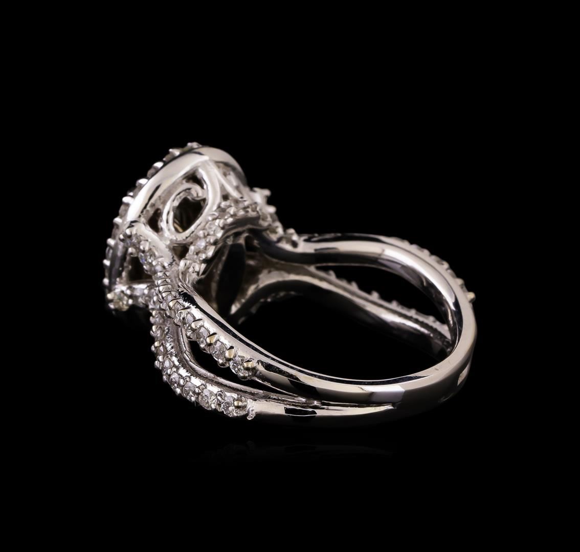 One electronically tested 14KT white gold ladies cast diamond engagement ring with a bright polish finish. Identified with markings of "K14". Condition is new. Containing: One prong set round brilliant cut diamond, measuring 6.60 - 4.30 x 3.27mm (depth est.) approximate weight of 0.59ct. Clarity: I-1. Color: J, Cut is Good. Seventy-Six prong set round brilliant cut diamonds, measuring 1.30 - 1.30 x 0.78mm (depth est.) approximate total weight of 76 Stones = 0.61ct. Clarity: SI-2 to I-2. Color: H - I, Cut is Good. All diamonds are graded in the mounting, unless otherwise stated. Total Weight of Diamonds 1.20ct. Total Weight of Ring 8.00 grams. GGL Appraised at $5,570.00.