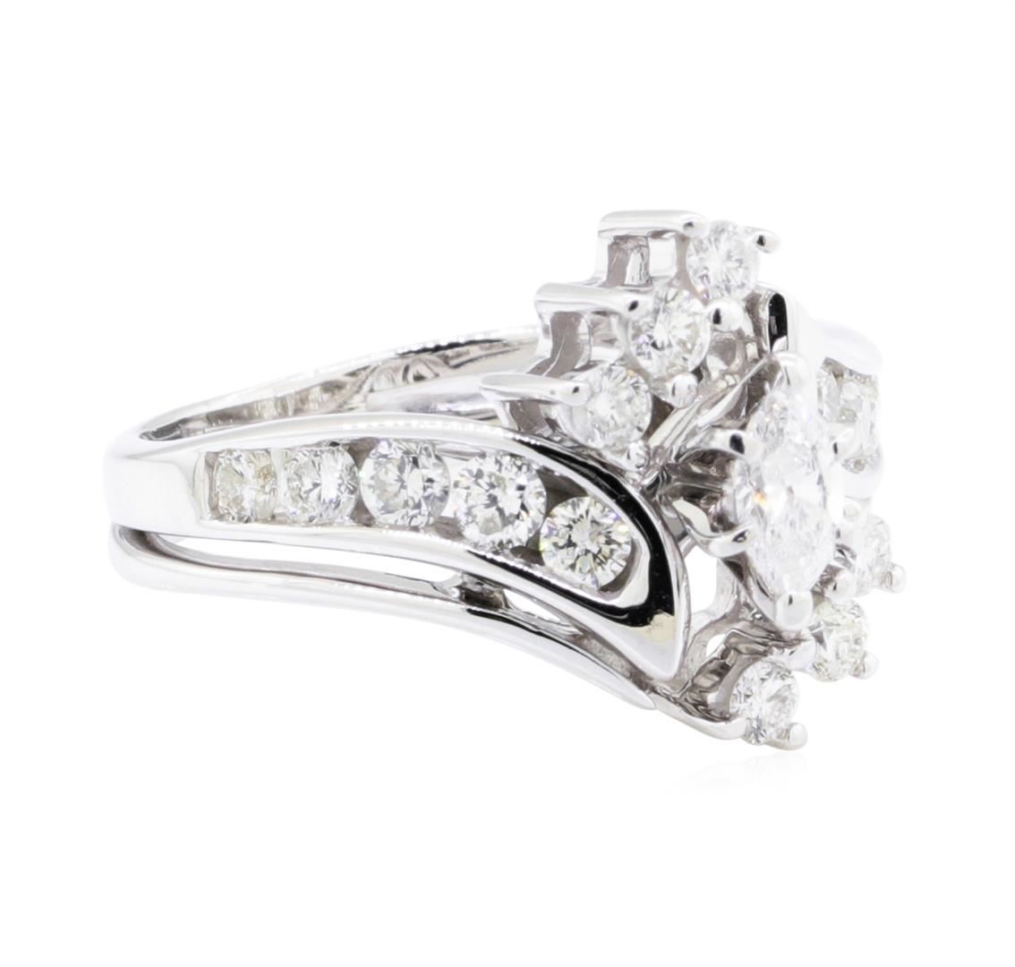 One electronically tested 14KT white gold lady's combination cast & assembled wedding ring soldered to wedding band with a bright polish finish. The featured lady's ring has a double shank measuring 3.44 millimeters wide. Identified with markings of '14K'. Condition is like new, good workmanship. Containing: One prong set marquise shaped cut diamond, measuring 5.80 x 3.75 x 2.36mm (depth est.) approximate weight of 0.30ct. Graded in the setting. Color H Clarity SI-2 Cut Very Good Ten channel set round brilliant cut diamonds, measuring 2.60 - 2.50 x 1.58mm (depth est.) approximate total weight of 10 Stones = 0.63ct. Graded in the setting. Color H - I Clarity SI-1 to I-1 Cut Good Six prong set round brilliant cut diamonds, measuring 2.30 - 2.25 x 1.42mm (depth est.) approximate total weight of 6 Stones = 0.27ct. Graded in the setting. Color H - I Clarity SI-2 to I-1 Cut Good. Total Weight of Diamonds 1.20ct. Total Weight of Ring Soldered To Wedding Band 5.50gm. GAS Appraised.
