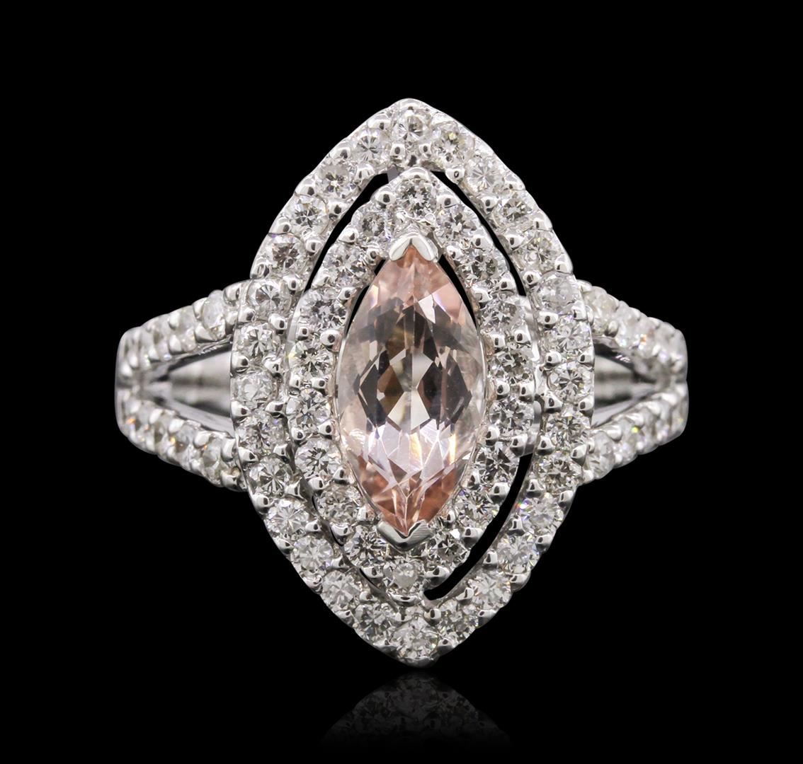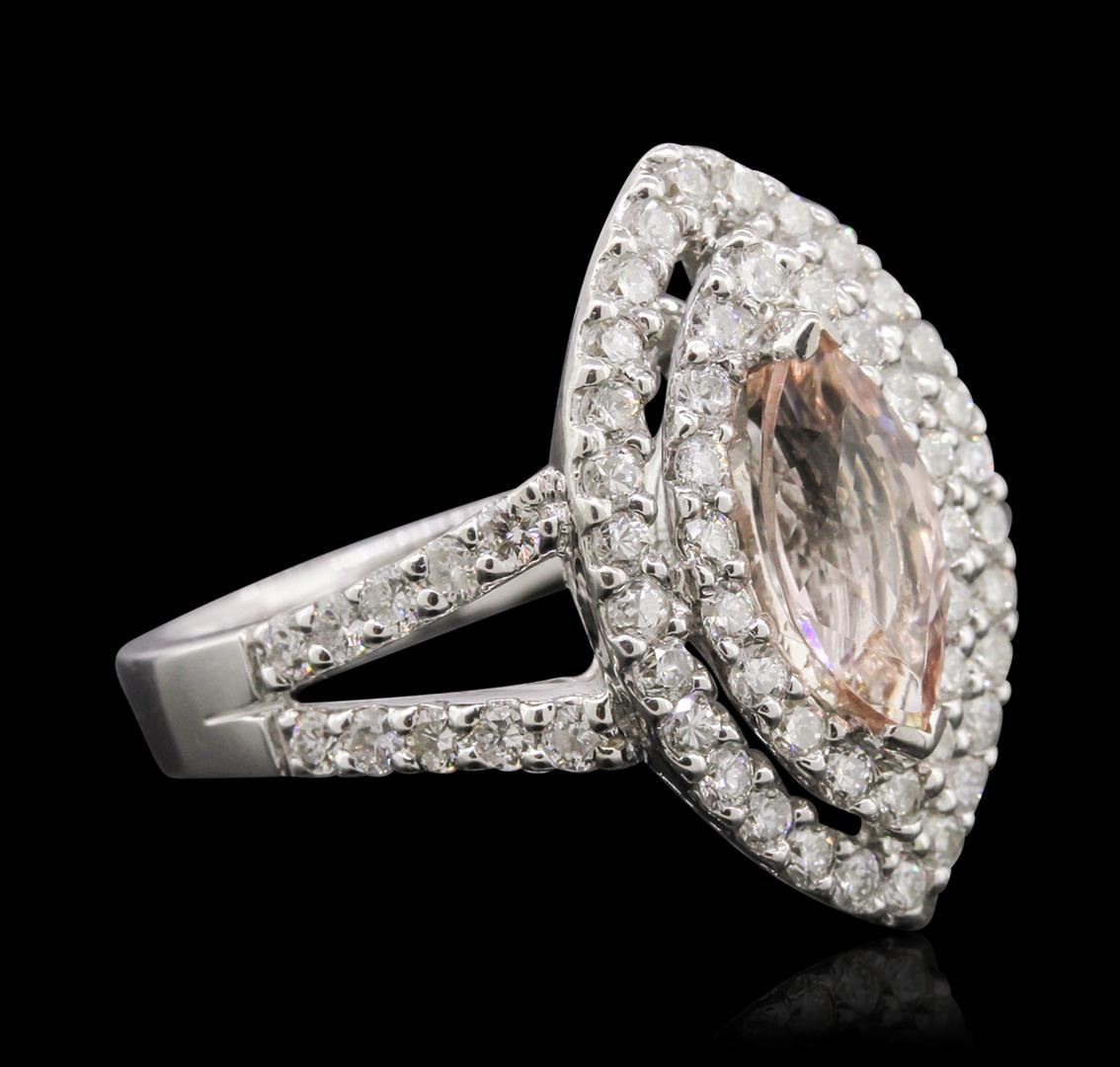 One electronically tested 14KT white gold Ladies combination cast & assembled ring with a bright polish finish. Condition is new. Identified with markings of "14K". Containing: Sixty-Six prong set round brilliant cut diamonds, measuring 1.70 - 1.70 x 1.02mm (depth est.) approximate. Total Weight of 66 Stones = 1.24ct. Clarity: I-1 to I-2. Color: H - J, Cut is Good. One prong set marquise modified brilliant cut natural morganite, measuring 11.00 x 5.00 x 3.25mm, approximate weight of 1.20ct., clarity is eye clean, type I, light, brownish, reddish orange color, (GIA rO 3/1), cut is very good. Colored gemstones are presumed to have been subjected to commonly used color/clarity enhancement processes. Total Weight of Colored Stones 1.20ct. Total Weight of Diamonds 1.24ct. Total Weight of Ring 7.20 grams. GGL Appraised at $5,185.00.