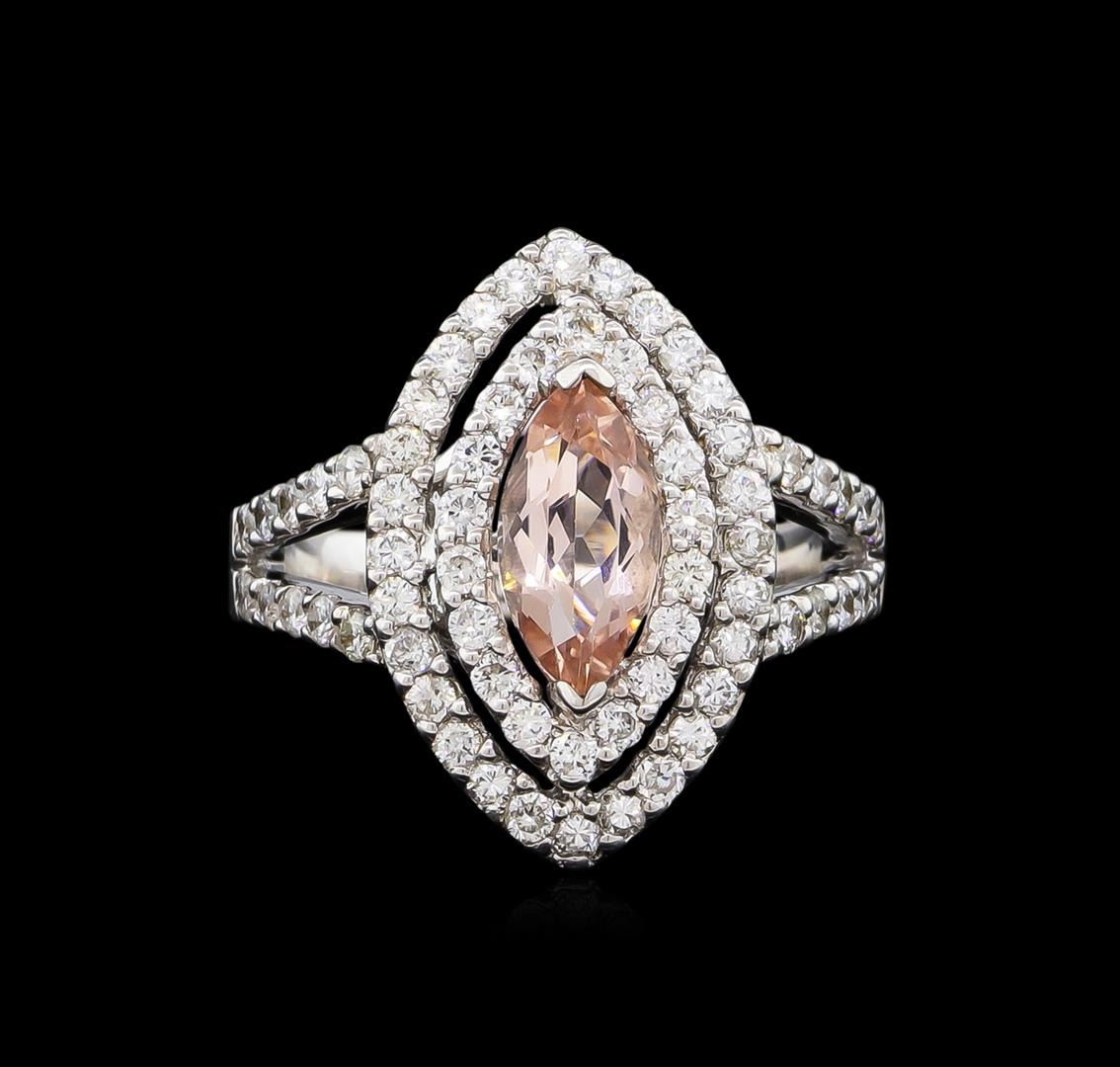 One electronically tested 14KT white gold Ladies combination cast & assembled ring with a bright polish finish. Condition is new. Identified with markings of "14K". Containing: Sixty-Six prong set round brilliant cut diamonds, measuring 1.70 - 1.70 x 1.02mm (depth est.) approximate. Total Weight of 66 Stones = 1.24ct. Clarity: I-1 to I-2. Color: H - J, Cut is Good. One prong set marquise modified brilliant cut natural morganite, measuring 11.00 x 5.00 x 3.25mm, approximate weight of 1.20ct., clarity is eye clean, type I, light, brownish, reddish orange color, (GIA rO 3/1), cut is very good. Colored gemstones are presumed to have been subjected to commonly used color/clarity enhancement processes. Total Weight of Colored Stones 1.20ct. Total Weight of Diamonds 1.24ct. Total Weight of Ring 7.20 grams. GGL Appraised at $5,185.00.