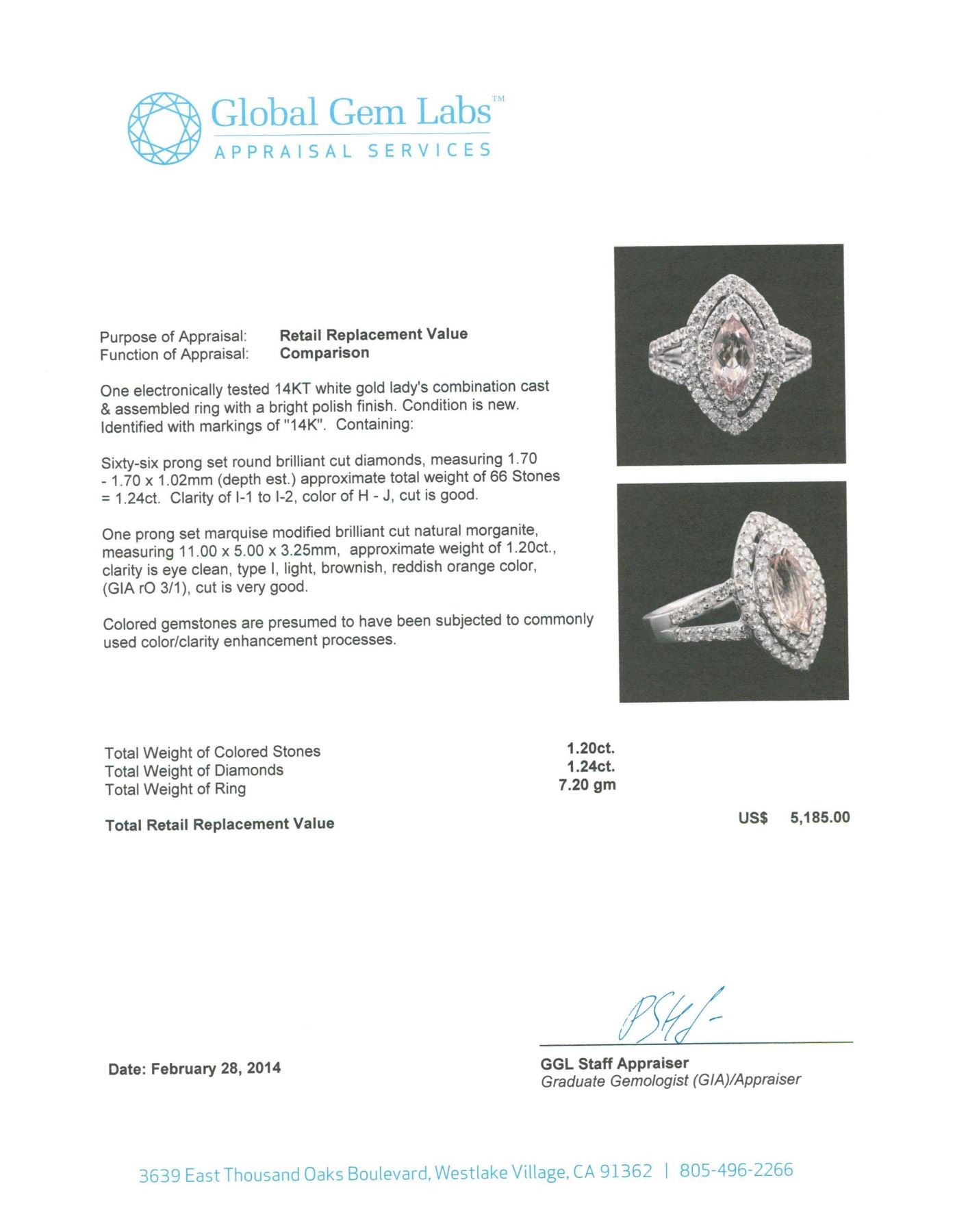 One electronically tested 14KT white gold Ladies combination cast & assembled ring with a bright polish finish. Condition is new. Identified with markings of "14K". Containing: Sixty-Six prong set round brilliant cut diamonds, measuring 1.70 - 1.70 x 1.02mm (depth est.) approximate. Total Weight of 66 Stones = 1.24ct. Clarity: I-1 to I-2. Color: H - J, Cut is Good. One prong set marquise modified brilliant cut natural morganite, measuring 11.00 x 5.00 x 3.25mm, approximate weight of 1.20 ct., clarity is eye clean, type I, light, brownish, reddish orange color, (GIA rO 3/1), cut is very good. Colored gemstones are presumed to have been subjected to commonly used color/clarity enhancement processes. Total Weight of Colored Stones 1.20 ct. Total Weight of Diamonds 1.24ct. Total Weight of Ring 7.20 grams. GGL Appraised.