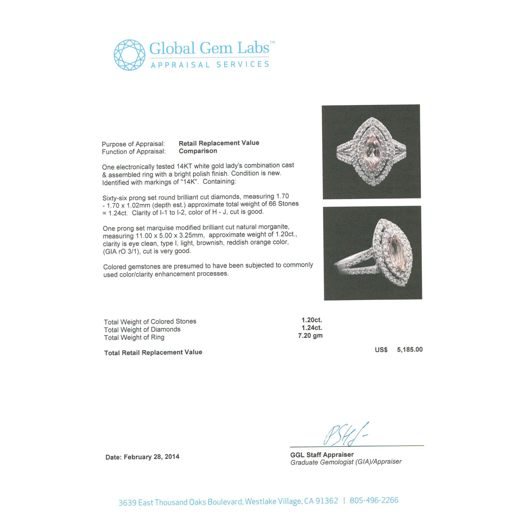 One electronically tested 14KT white gold Ladies combination cast & assembled ring with a bright polish finish. Condition is new. Identified with markings of "14K". Containing: Sixty-Six prong set round brilliant cut diamonds, measuring 1.70 - 1.70 x 1.02mm (depth est.) approximate. Total Weight of 66 Stones = 1.24ct. Clarity: I-1 to I-2. Color: H - J, Cut is Good. One prong set marquise modified brilliant cut natural morganite, measuring 11.00 x 5.00 x 3.25mm, approximate weight of 1.20 ct., clarity is eye clean, type I, light, brownish, reddish orange color, (GIA rO 3/1), cut is very good. Colored gemstones are presumed to have been subjected to commonly used color/clarity enhancement processes. Total Weight of Colored Stones 1.20 ct. Total Weight of Diamonds 1.24ct. Total Weight of Ring 7.20 grams. GGL Appraised.