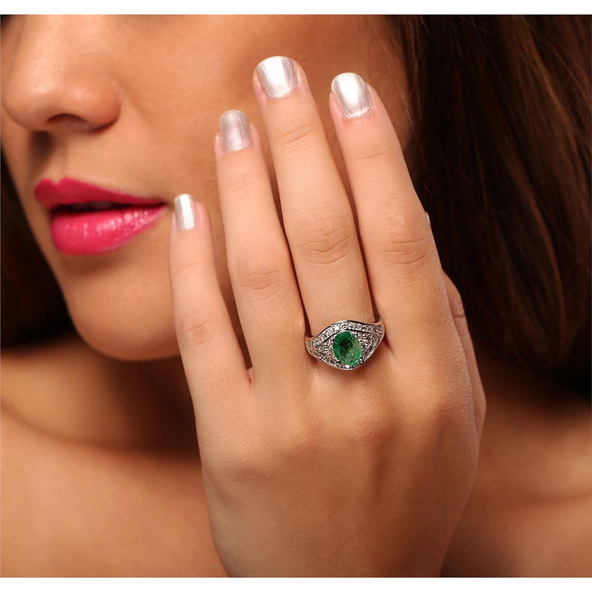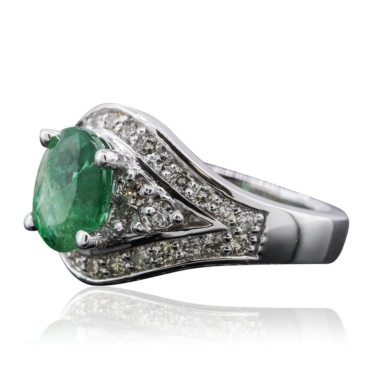 One electronically tested 14KT white gold Ladies combination cast & assembled fashion ring with a high polish finish. Condition is new. Identified with markings of "14K". Containing: One prong set oval modified mixed cut natural emerald, measuring 9.10 x 6.53 x 3.60mm, approximate weight of 1.20ct., clarity is heavily included, type III, medium, very slightly grayish, very slightly bluish green color, (GIA vslbG 5/3), cut is good. Colored gemstones are presumed to have been subjected to commonly used and possible undetectable color/clarity enhancement processes. Thirty-Four prong set round brilliant cut diamonds, measuring 1.50 - 1.50 x 0.90mm (depth est.) approximate total weight of 34 Stones = 0.42ct. Clarity of SI-1 to I-1, Color of J - K, Cut is Good. Total Weight of Colored Stones 1.20ct. Total Weight of Diamonds 0.42ct. Total Weight of Ring 7.10 grams. GGL Appraised at $5,975.00.