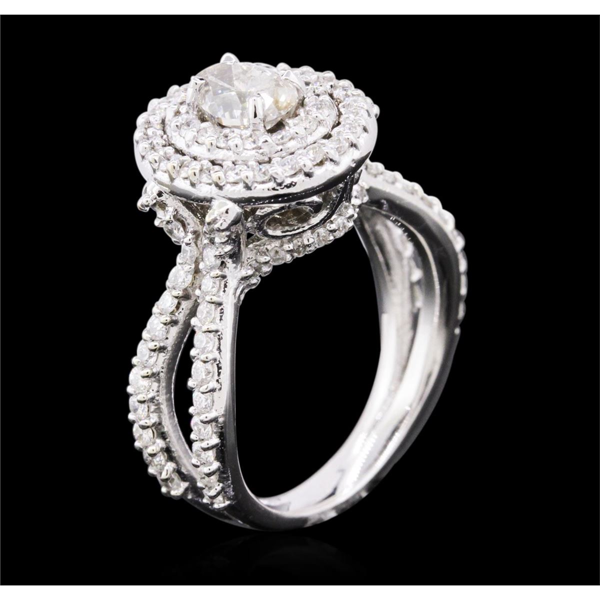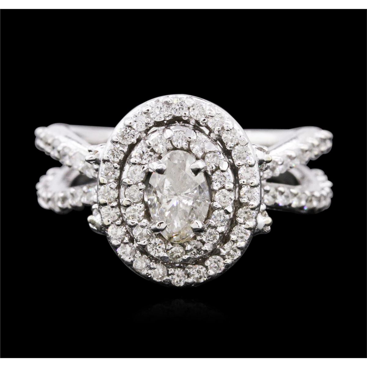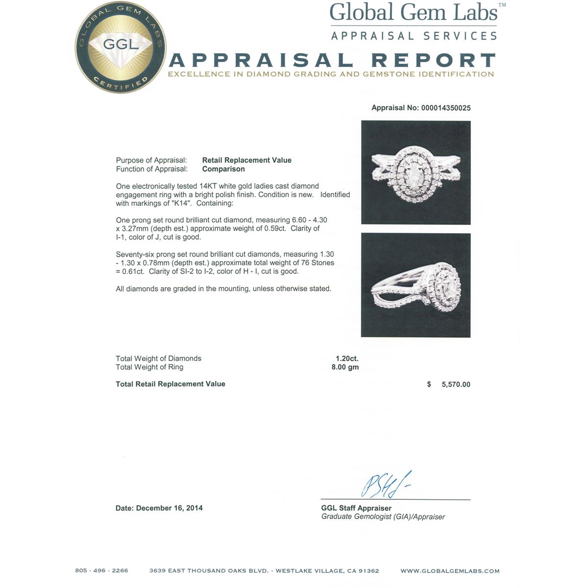 One electronically tested 14KT white gold ladies cast diamond engagement ring with a bright polish finish. Identified with markings of "K14". Condition is new. Containing: One prong set round brilliant cut diamond, measuring 6.60 - 4.30 x 3.27mm (depth est.) approximate weight of 0.59ct. Clarity: I-1. Color: J, Cut is Good. Seventy-Six prong set round brilliant cut diamonds, measuring 1.30 - 1.30 x 0.78mm (depth est.) approximate total weight of 76 Stones = 0.61ct. Clarity: SI-2 to I-2. Color: H - I, Cut is Good. All diamonds are graded in the mounting, unless otherwise stated. Total Weight of Diamonds 1.20ct. Total Weight of Ring 8.00 grams. GGL Appraised at $5,570.00.