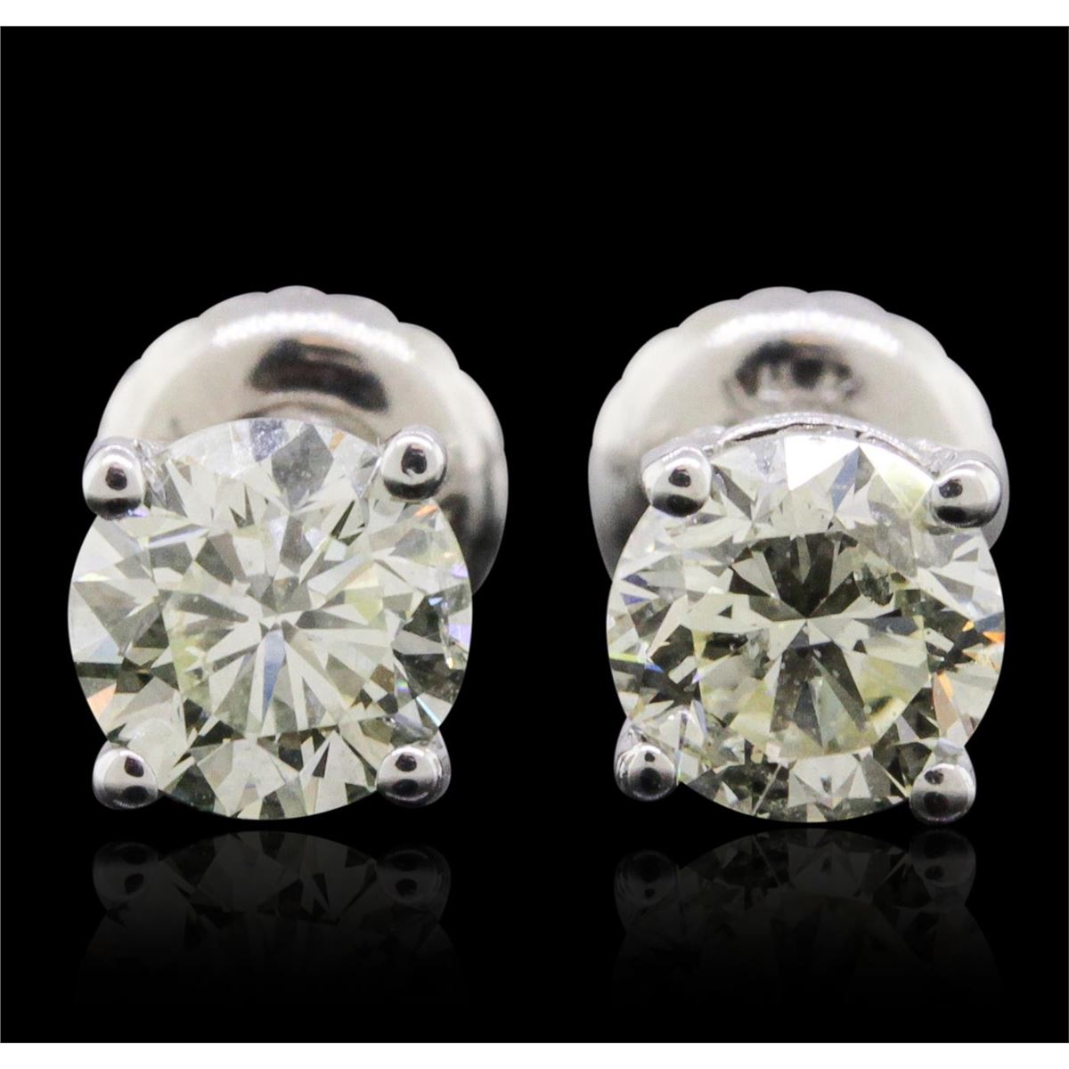 One pair electronically tested 14KT white gold cast & assembled diamond solitaire earrings with screw backs. Bright polish finish. Condition is new, good workmanship. Containing: One prong set round brilliant cut diamond, measuring 5.02 - 5.01 x 3.40mm (depth est.), 3.00% GTCF approximate weight of 0.63ct with a medium blue fluorescence. Graded in the setting. Clarity: I-1. Depth: 67.7%. Table 59.8%. One prong set round brilliant cut diamond, measuring 4.90 - 4.80 x 3.20mm (depth est.), 3.00% GTCF approximate weight of 0.57ct. Graded in the setting. Clarity: I-1. Depth: 66.0%. Table 67.0%. Total Weight of Diamonds 1.20ct. Total Weight of Earrings 0.93 grams. AIG Appraised at $3,895.00.