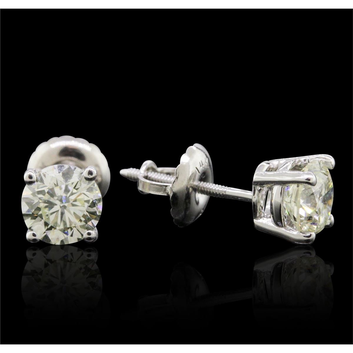 One pair electronically tested 14KT white gold cast & assembled diamond solitaire earrings with screw backs. Bright polish finish. Condition is new, good workmanship. Containing: One prong set round brilliant cut diamond, measuring 5.02 - 5.01 x 3.40mm (depth est.), 3.00% GTCF approximate weight of 0.63ct with a medium blue fluorescence. Graded in the setting. Clarity: I-1. Depth: 67.7%. Table 59.8%. One prong set round brilliant cut diamond, measuring 4.90 - 4.80 x 3.20mm (depth est.), 3.00% GTCF approximate weight of 0.57ct. Graded in the setting. Clarity: I-1. Depth: 66.0%. Table 67.0%. Total Weight of Diamonds 1.20ct. Total Weight of Earrings 0.93 grams. AIG Appraised at $3,895.00.