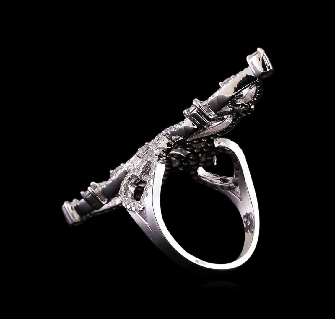 One electronically tested 14KT white gold ladies cast diamond ring with a bright polish finish. Identified with markings of "K14". Condition is new. Containing: Fourteen prong set round brilliant cut diamonds, measuring 2.00 - 2.20 x 1.26mm (depth est.) approximate total weight of 14 Stones = 0.48ct. Clarity: SI-2 to I-1. Color: J - K, Cut is Good. One Hundred Fifty-Two prong set round brilliant cut diamonds, measuring 1.10 - 1.10 x 0.66mm (depth est.) approximate total weight of 152 Stones = 0.73ct. Clarity: I-1 to I-2. Color: I - J, Cut is Good. All diamonds are graded in the mounting, unless otherwise stated. Total Weight of Diamonds 1.21ct. Total Weight of Ring 9.50 grams. GGL Appraised at $5,205.00.