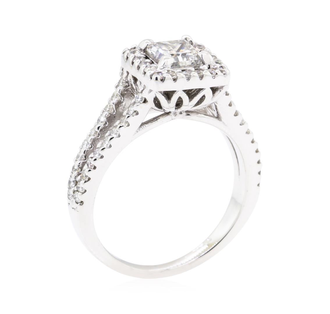 One electronically tested 14KT white gold lady's cast fashion ring with a split shank cushion halo with a bright polish finish. The featured lady's ring has a shank measuring 1.50 millimeters wide. Identified with markings of '14K'. Condition is new, good workmanship. Containing: One prong set princess cut diamond, measuring 4.90 x 4.65 x 3.49mm (depth est.) approximate weight of 0.65ct. Graded in the setting. Color I - J Clarity SI-2 Cut Very Good Sixty prong set round brilliant cut diamonds, measuring 1.40 - 1.30 x 0.84mm (depth est.) approximate total weight of 60 Stones = 0.56ct. Graded in the setting. Color H - I Clarity SI-1 to SI-2 Cut Good. Total Weight of Diamonds 1.21ct.. Total Weight of Ring 4.90gm. GAS Appraised.