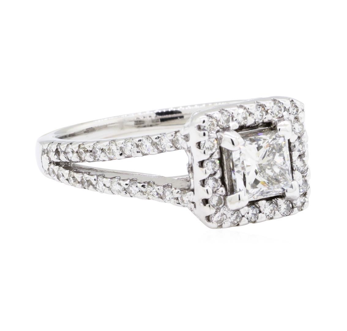 One electronically tested 14KT white gold lady's cast fashion ring with a split shank cushion halo with a bright polish finish. The featured lady's ring has a shank measuring 1.50 millimeters wide. Identified with markings of '14K'. Condition is new, good workmanship. Containing: One prong set princess cut diamond, measuring 4.90 x 4.65 x 3.49mm (depth est.) approximate weight of 0.65ct. Graded in the setting. Color I - J Clarity SI-2 Cut Very Good Sixty prong set round brilliant cut diamonds, measuring 1.40 - 1.30 x 0.84mm (depth est.) approximate total weight of 60 Stones = 0.56ct. Graded in the setting. Color H - I Clarity SI-1 to SI-2 Cut Good. Total Weight of Diamonds 1.21ct.. Total Weight of Ring 4.90gm. GAS Appraised.