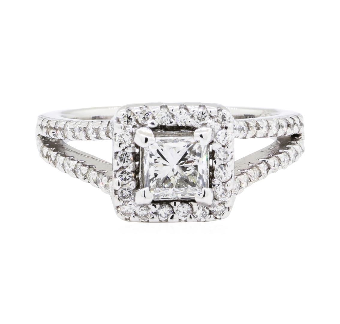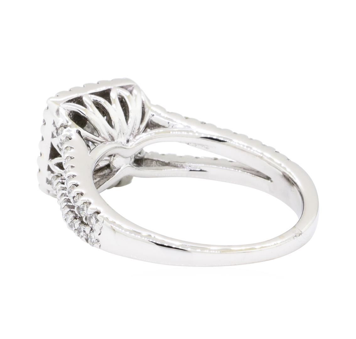 One electronically tested 14KT white gold lady's cast fashion ring with a split shank cushion halo with a bright polish finish. The featured lady's ring has a shank measuring 1.50 millimeters wide. Identified with markings of '14K'. Condition is new, good workmanship. Containing: One prong set princess cut diamond, measuring 4.90 x 4.65 x 3.49mm (depth est.) approximate weight of 0.65ct. Graded in the setting. Color I - J Clarity SI-2 Cut Very Good Sixty prong set round brilliant cut diamonds, measuring 1.40 - 1.30 x 0.84mm (depth est.) approximate total weight of 60 Stones = 0.56ct. Graded in the setting. Color H - I Clarity SI-1 to SI-2 Cut Good. Total Weight of Diamonds 1.21ct.. Total Weight of Ring 4.90gm. GAS Appraised.