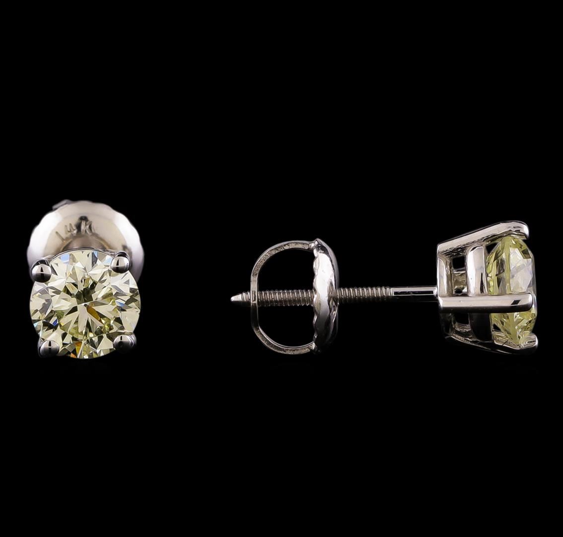 One pair electronically tested 14KT white gold cast & assembled diamond solitaire earrings with screw backs. Bright polish finish. Condition is new, good workmanship. Containing: One prong set round brilliant cut diamond, measuring 5.10 - 5.05 x 3.30mm (depth est.) approximate weight of 0.61ct with a faint blue fluorescence. Graded in the setting. Clarity: SI-2. Depth: 65.1%. Table 59.2%. One prong set round brilliant cut diamond, measuring 5.00 - 4.90 x 3.40mm (depth est.) approximate weight of 0.60ct with a faint blue fluorescence. Graded in the setting. Clarity: SI-2. Depth: 68.7%. Table 62.6%. Total Weight of Diamonds 1.21ct. Total Weight of Earrings 0.98 grams. AIG Appraised at $4,135.00.