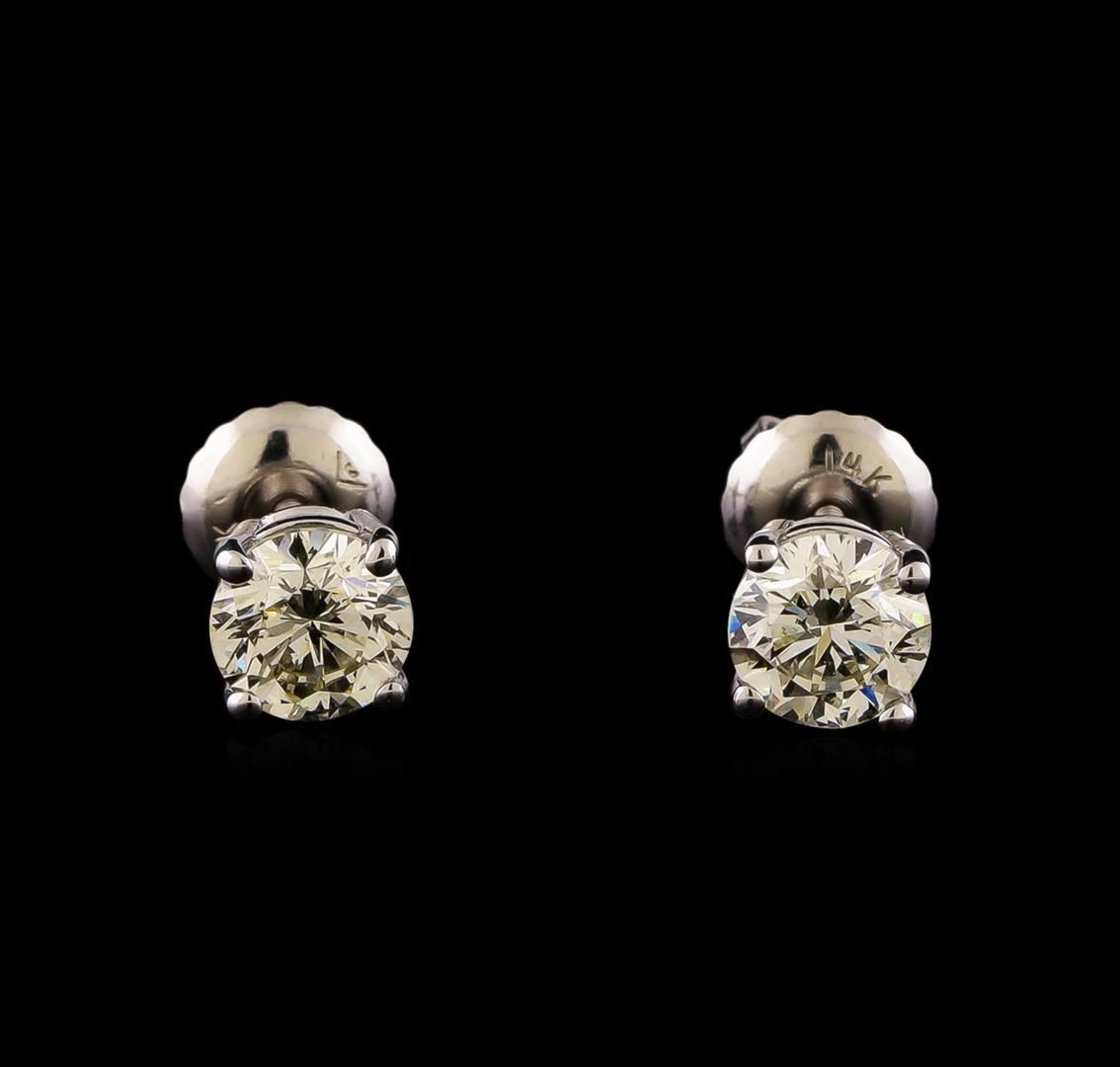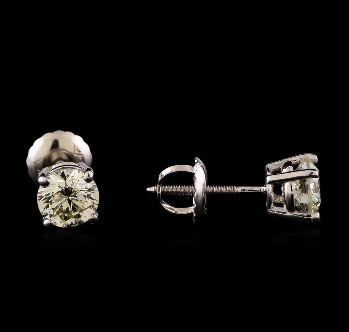 One pair electronically tested 14KT white gold cast & assembled diamond solitaire earrings with screw backs. Bright polish finish. Condition is new, good workmanship. Containing: One prong set round brilliant cut diamond, measuring 5.10 - 5.00 x 3.25mm (depth est.), 3.00% GTCF approximate weight of 0.62ct. Graded in the setting. Clarity: SI-2. Color: 64.4%. Table 57.4%. One prong set round brilliant cut diamond, measuring 4.96 - 4.95 x 3.20mm (depth est.), 3.00% GTCF approximate weight of 0.59ct. Graded in the setting. Clarity: SI-2. Color: 64.5%. Table 58.5%. Total Weight of Diamonds 1.21ct. Total Weight of Earrings 0.96 grams. AIG Appraised at $4,330.00.