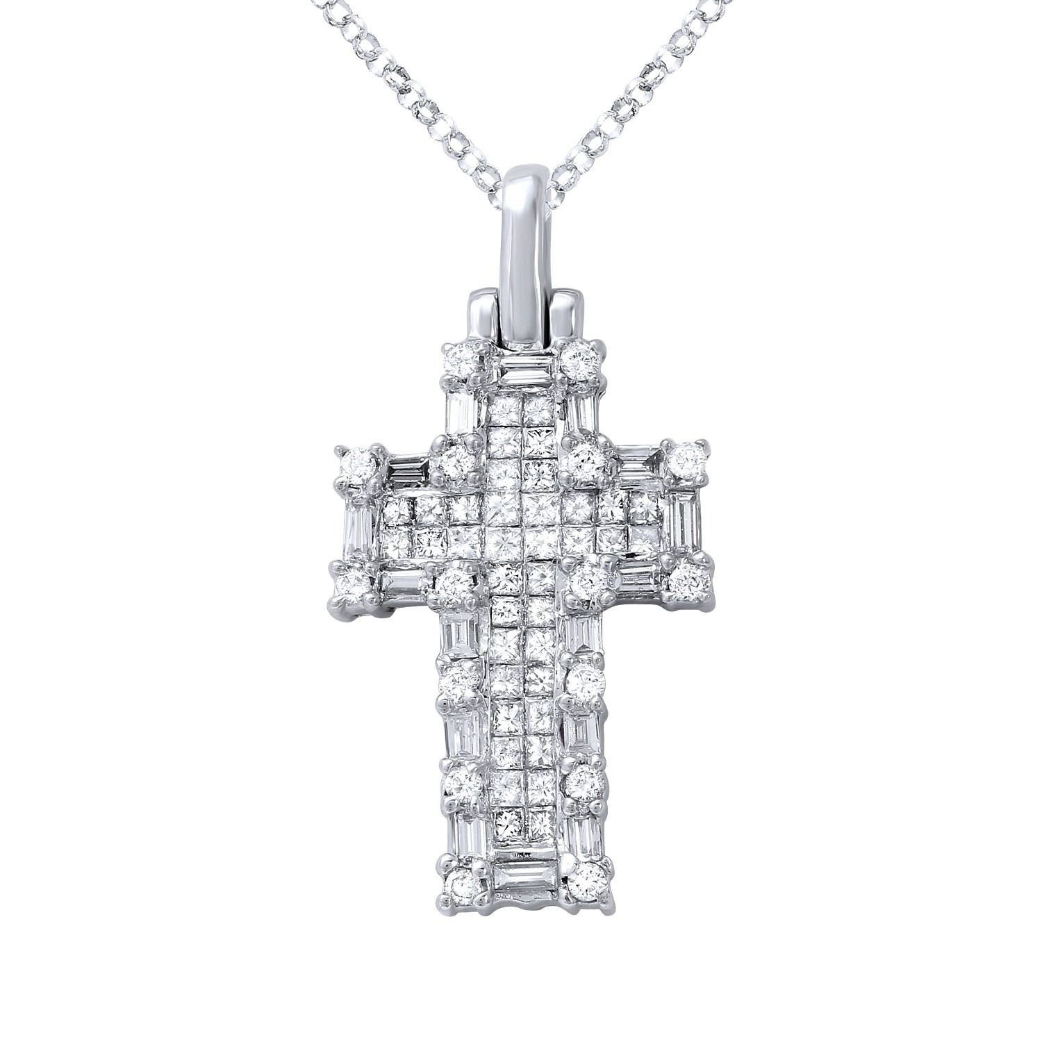One 14KT White Gold 1.21ctw Diamond Pendant with Chain. (38) princess cut Diamonds with a total weight of 0.60cts with a color of I and clarity of I-1. (16) round Diamonds with a total weight of 0.21cts with a color of I and clarity of I-1. (16) Baguette Diamonds with a total weight of 0.40cts with a color of I and clarity of I-1. Total weight of this pendant with chain is 4.55 grams.