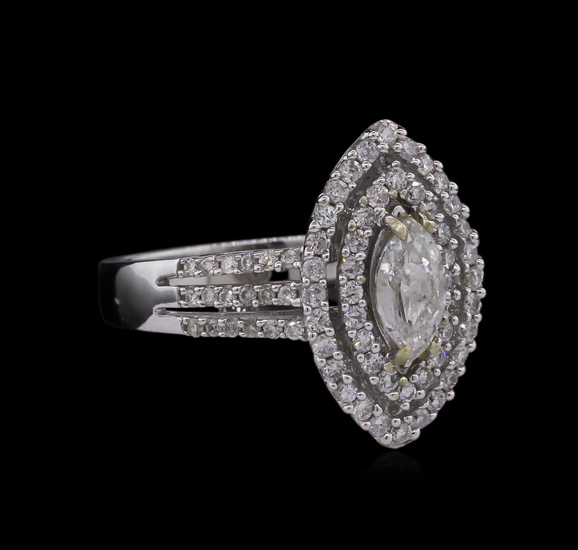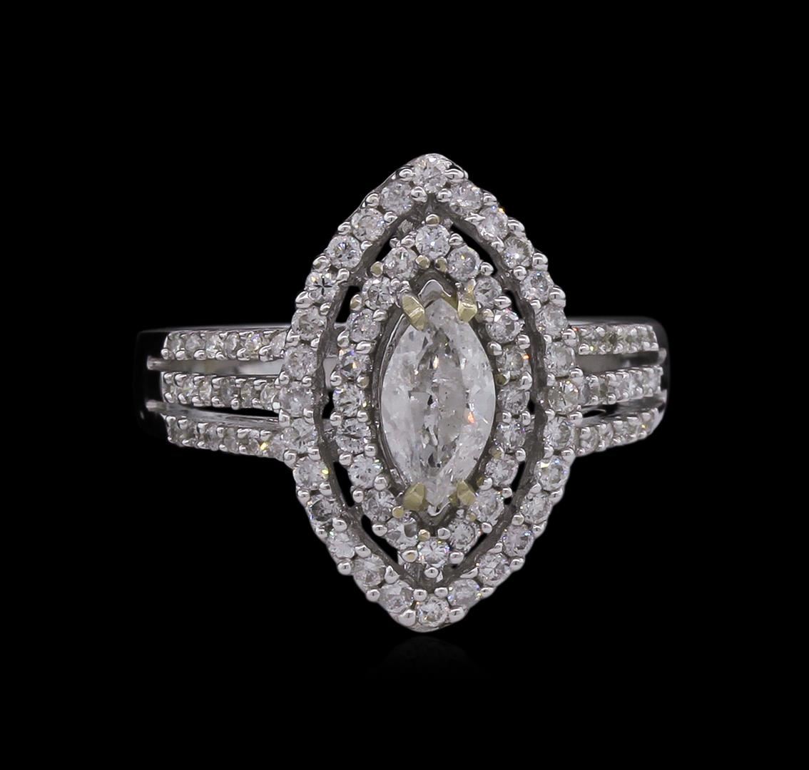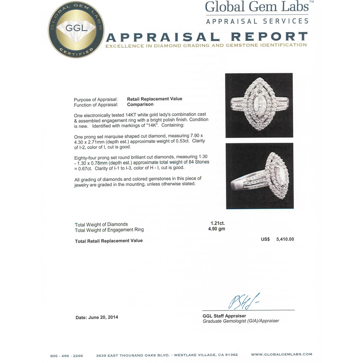 One electronically tested 14KT white gold Ladies combination cast & assembled engagement ring with a bright polish finish. Condition is new. Identified with markings of "14K". Containing: One prong set marquise shaped cut diamond, measuring 7.90 x 4.30 x 2.71mm (depth est.) approximate weight of 0.53ct. Clarity: I-2. Color: I, Cut is Good. Eighty-Four prong set round brilliant cut diamonds, measuring 1.30 - 1.30 x 0.78mm (depth est.) approximate. Total Weight of 84 Stones = 0.67ct. Clarity: I-1 to I-3. Color: H - I, Cut is Good. All grading of diamonds and colored gemstones in this piece of jewelry are graded in the mounting, unless otherwise stated. Total Weight of Diamonds 1.21ct. Total Weight of Engagement Ring 4.90 grams. GGL Appraised at $5,410.00.