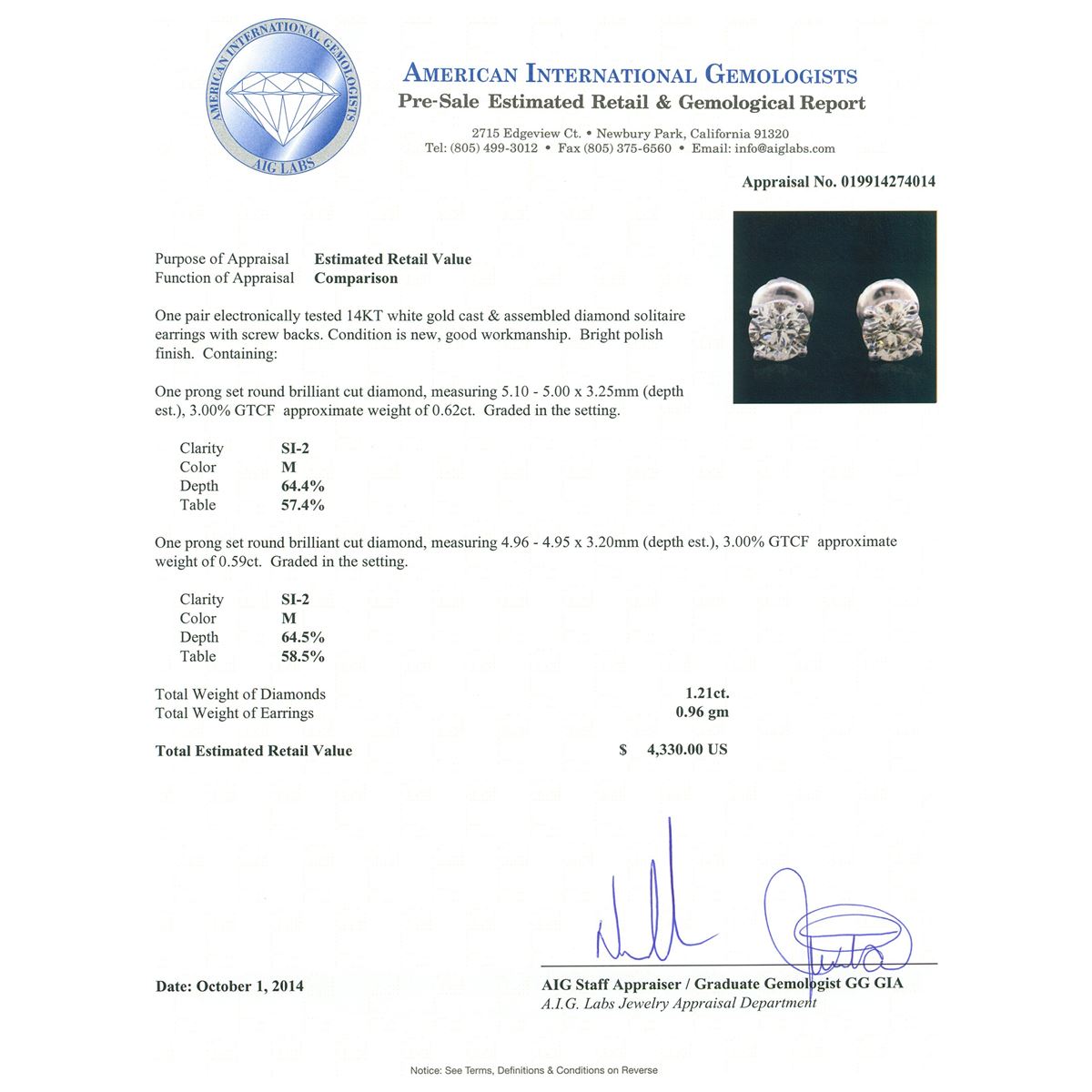 One pair electronically tested 14KT white gold cast & assembled diamond solitaire earrings with screw backs. Bright polish finish. Condition is new, good workmanship. Containing: One prong set round brilliant cut diamond, measuring 5.10 - 5.00 x 3.25mm (depth est.), 3.00% GTCF approximate weight of 0.62ct. Graded in the setting. Clarity: SI-2. Color: 64.4%. Table 57.4%. One prong set round brilliant cut diamond, measuring 4.96 - 4.95 x 3.20mm (depth est.), 3.00% GTCF approximate weight of 0.59ct. Graded in the setting. Clarity: SI-2. Color: 64.5%. Table 58.5%. Total Weight of Diamonds 1.21ct. Total Weight of Earrings 0.96 grams. AIG Appraised at $4,330.00.