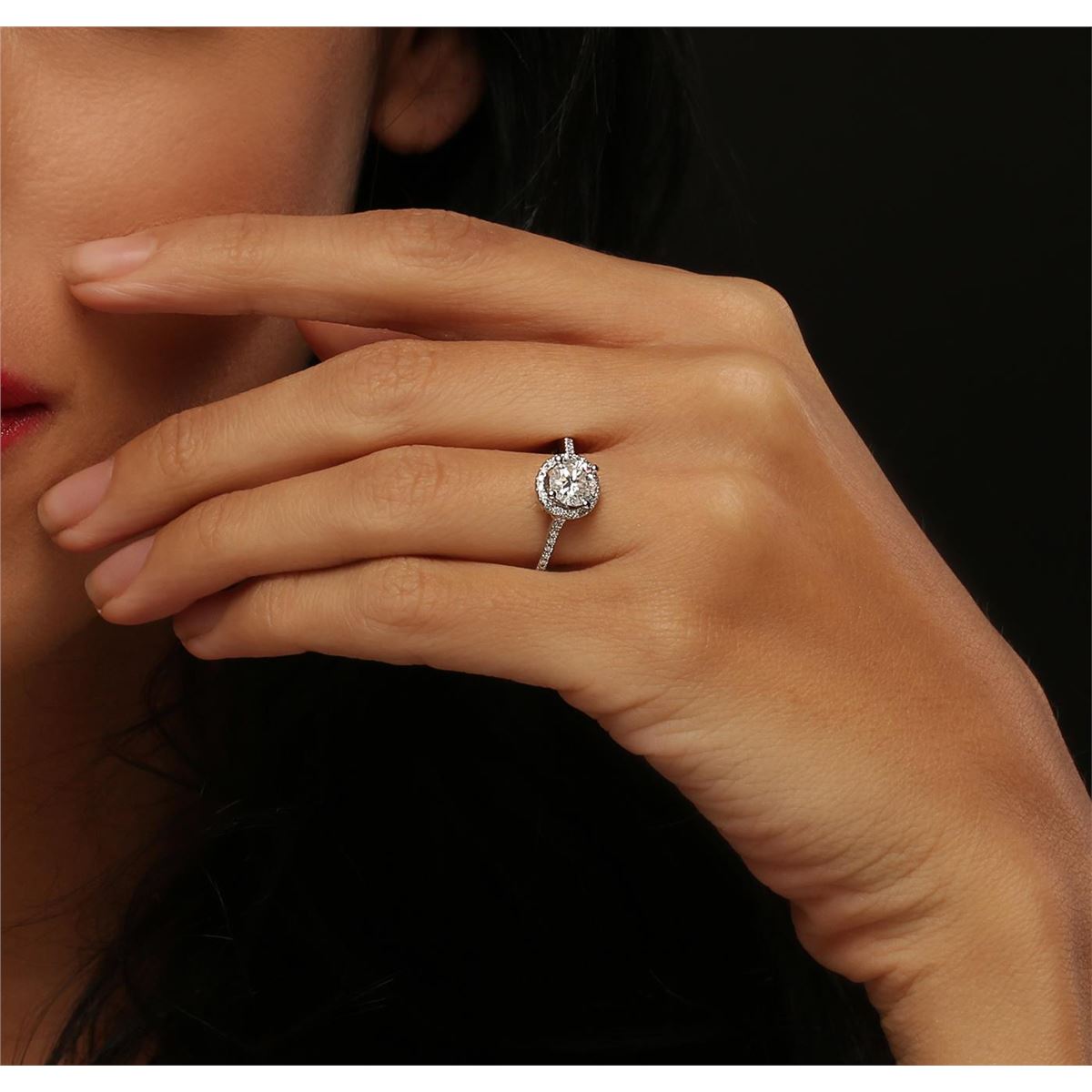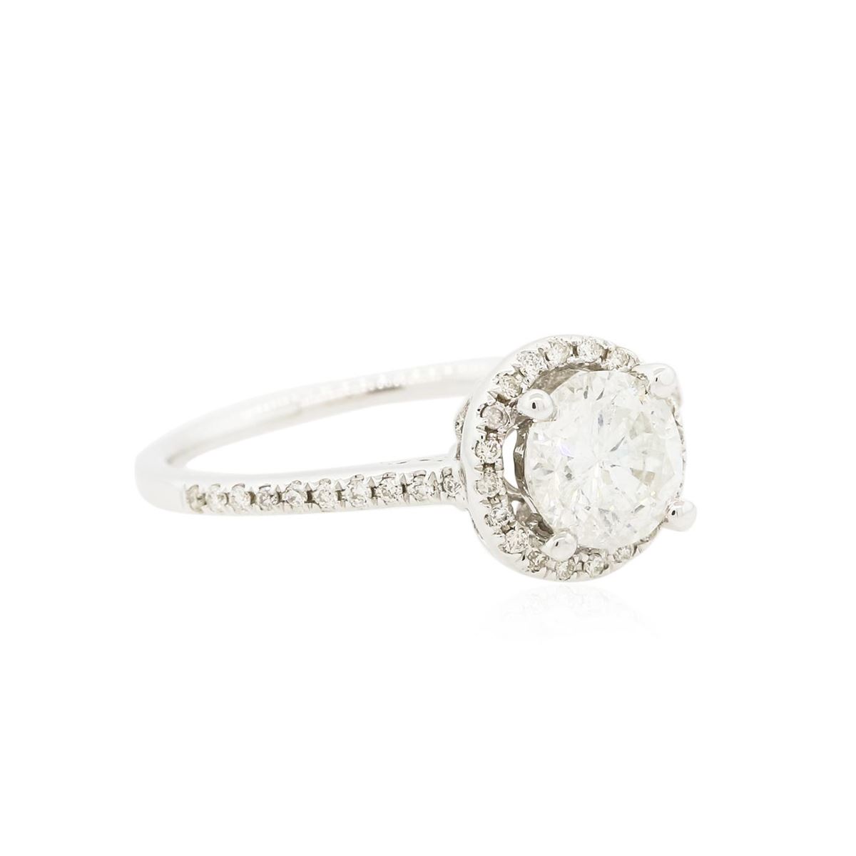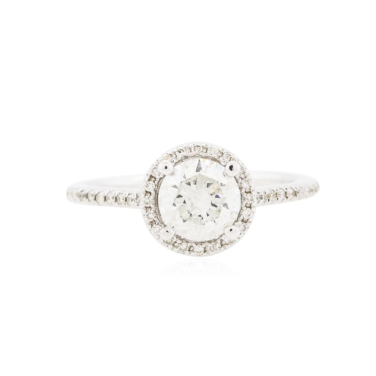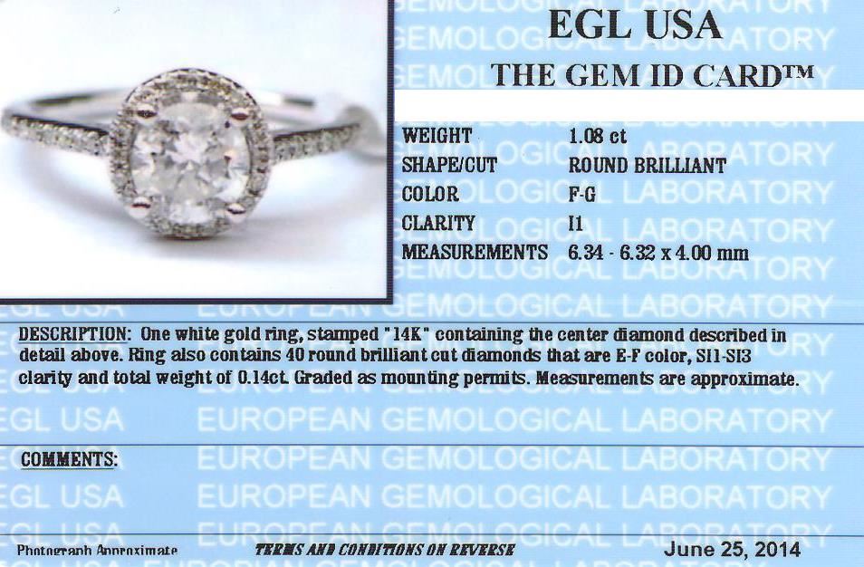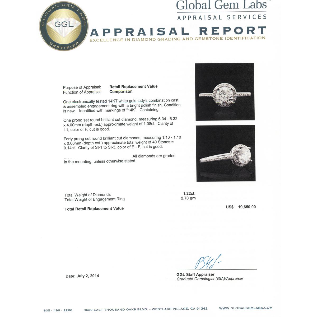 One electronically tested 14KT white gold Ladies combination cast & assembled engagement ring with a bright polish finish. Condition is new. Identified with markings of "14K". Containing: One prong set round brilliant cut diamond, measuring 6.34 - 6.32 x 4.00mm (depth est.) approximate weight of 1.08ct. Clarity: I-1. Color: F, Cut is Good. Forty prong set round brilliant cut diamonds, measuring 1.10 - 1.10 x 0.66mm (depth est.) approximate. Total Weight of 40 Stones = 0.14ct. Clarity: SI-1 to SI-3. Color: E - F, Cut is Good. EGL USA GEM ID# US 911348408D. All diamonds are graded in the mounting, unless otherwise stated. Total Weight of Diamonds 1.22ct. Total Weight of Engagement Ring 2.70 grams. GGL Appraised at $19,650.00.