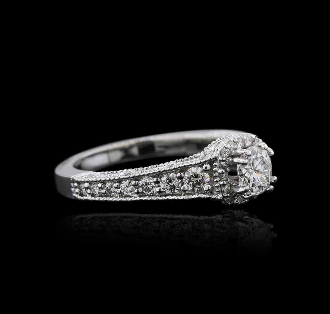 One electronically tested 14KT white gold ladies cast diamond engagement ring with a bright polish finish. Identified with markings of "14K". Condition is new. Containing: One prong set round brilliant cut diamond, measuring 5.20 - 5.20 x 3.25mm (depth est.) approximate weight of 0.54ct. Clarity: SI-2. Color: J, Cut is Good. Two prong set round brilliant cut diamonds, measuring 2.90 - 2.90 x 1.74mm (depth est.) approximate total weight of 2 Stones = 0.18ct. Clarity: SI-1 to SI-2. Color: H - I, Cut is Good. Twenty-Eight prong set round brilliant cut diamonds, measuring 2.20 - 1.20 x 1.02mm (depth est.) approximate total weight of 28 Stones = 0.50ct. Clarity: SI-1 to I-1. Color: I - J, Cut is Good. All diamonds are graded in the mounting, unless otherwise stated. Total Weight of Diamonds 1.22ct. Total Weight of Engagement Ring 4.70 grams. GGL Appraised at $5,660.00.