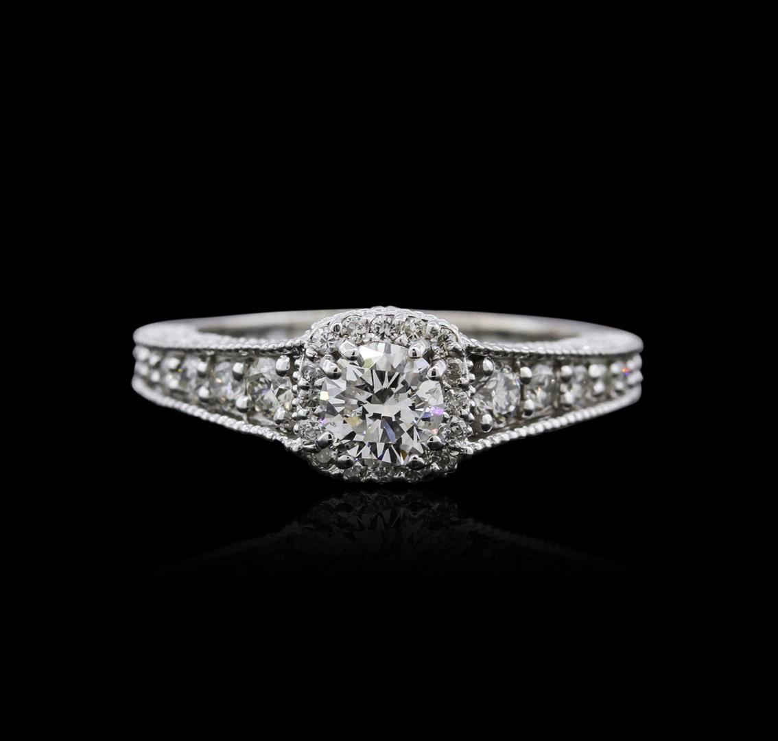 One electronically tested 14KT white gold ladies cast diamond engagement ring with a bright polish finish. Identified with markings of "14K". Condition is new. Containing: One prong set round brilliant cut diamond, measuring 5.20 - 5.20 x 3.25mm (depth est.) approximate weight of 0.54ct. Clarity: SI-2. Color: J, Cut is Good. Two prong set round brilliant cut diamonds, measuring 2.90 - 2.90 x 1.74mm (depth est.) approximate total weight of 2 Stones = 0.18ct. Clarity: SI-1 to SI-2. Color: H - I, Cut is Good. Twenty-Eight prong set round brilliant cut diamonds, measuring 2.20 - 1.20 x 1.02mm (depth est.) approximate total weight of 28 Stones = 0.50ct. Clarity: SI-1 to I-1. Color: I - J, Cut is Good. All diamonds are graded in the mounting, unless otherwise stated. Total Weight of Diamonds 1.22ct. Total Weight of Engagement Ring 4.70 grams. GGL Appraised at $5,660.00.