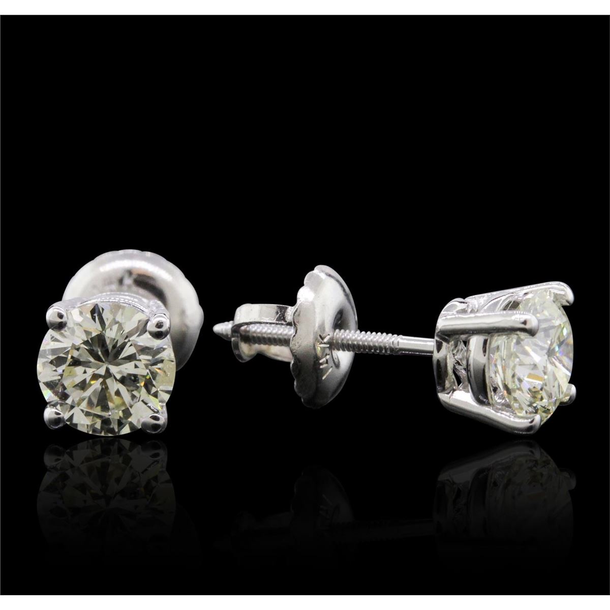 One pair electronically tested 14KT white gold cast & assembled diamond solitaire earrings with screw backs. Bright polish finish. Condition is new, good workmanship. Containing: One prong set round brilliant cut diamond, measuring 5.10 - 5.09 x 3.15mm (depth est.), 3.00% GTCF approximate weight of 0.61ct with a medium blue fluorescence. Graded in the setting. Clarity: I-1. Depth: 61.8%. Table 56.9%. One prong set round brilliant cut diamond, measuring 5.05 - 5.04 x 3.20mm (depth est.), 3.00% GTCF approximate weight of 0.61ct with a medium blue fluorescence. Graded in the setting. Clarity: I-1. Depth: 63.4%. Table 62.4%. Total Weight of Diamonds 1.22ct. Total Weight of Earrings 0.96 grams. AIG Appraised at $3,965.00.