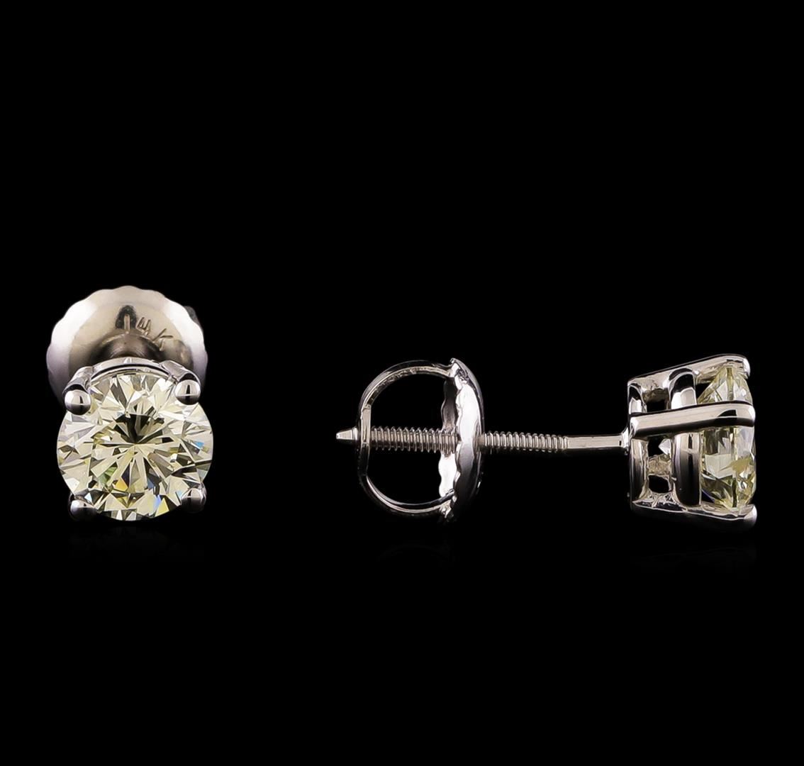 One pair electronically tested 14KT white gold cast & assembled diamond solitaire earrings with screw backs. Bright polish finish. Condition is new, good workmanship. Containing: One prong set round brilliant cut diamond, measuring 5.10 - 5.09 x 3.15mm (depth est.), 3.00% GTCF approximate weight of 0.61ct with a medium blue fluorescence. Graded in the setting. Clarity: I-1. Depth: 61.8%. Table 56.9%. One prong set round brilliant cut diamond, measuring 5.05 - 5.04 x 3.20mm (depth est.), 3.00% GTCF approximate weight of 0.61ct with a medium blue fluorescence. Graded in the setting. Clarity: I-1. Depth: 63.4%. Table 62.4%. Total Weight of Diamonds 1.22ct. Total Weight of Earrings 0.96 grams. AIG Appraised at $3,965.00.