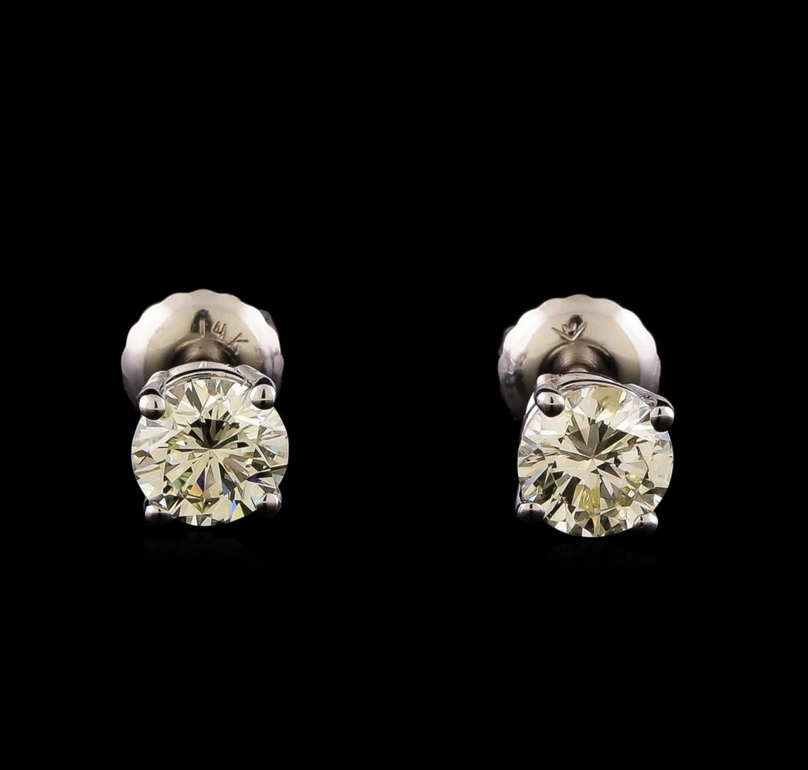 One pair electronically tested 14KT white gold cast & assembled diamond solitaire earrings with screw backs. Bright polish finish. Condition is new, good workmanship. Containing: One prong set round brilliant cut diamond, measuring 5.10 - 5.09 x 3.15mm (depth est.), 3.00% GTCF approximate weight of 0.61ct with a medium blue fluorescence. Graded in the setting. Clarity: I-1. Depth: 61.8%. Table 56.9%. One prong set round brilliant cut diamond, measuring 5.05 - 5.04 x 3.20mm (depth est.), 3.00% GTCF approximate weight of 0.61ct with a medium blue fluorescence. Graded in the setting. Clarity: I-1. Depth: 63.4%. Table 62.4%. Total Weight of Diamonds 1.22ct. Total Weight of Earrings 0.96 grams. AIG Appraised at $3,965.00.