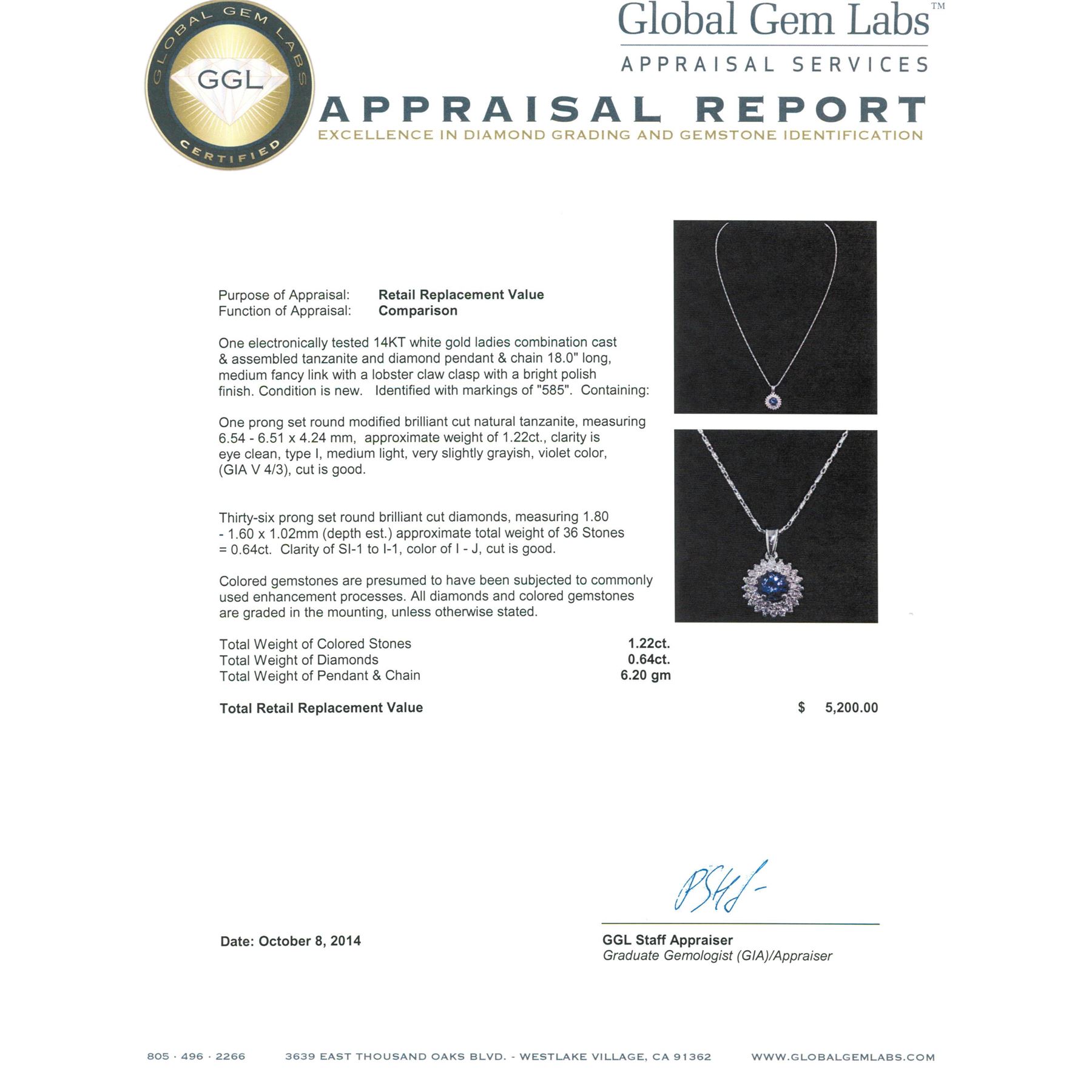 One electronically tested 14KT white gold ladies combination cast & assembled tanzanite and diamond pendant & chain 18.0" long, medium fancy link with a lobster claw clasp with a bright polish finish. Identified with markings of "585". Condition is new. Containing: One prong set round modified brilliant cut natural tanzanite, measuring 6.54 - 6.51 x 4.24 mm, approximate weight of 1.22ct., clarity is eye clean, type I, medium light, very slightly grayish, violet color, (GIA V 4/3), cut is good. Thirty-Six prong set round brilliant cut diamonds, measuring 1.80 - 1.60 x 1.02mm (depth est.) approximate total weight of 36 Stones = 0.64ct. Clarity: SI-1 to I-1. Color: I - J, Cut is Good. Colored gemstones are presumed to have been subjected to commonly used enhancement processes. All diamonds and colored gemstones are graded in the mounting, unless otherwise stated. Total Weight of Colored Stones 1.22ct. Total Weight of Diamonds 0.64ct. Total Weight of Pendant & Chain 6.20 grams. GGL Appraised.