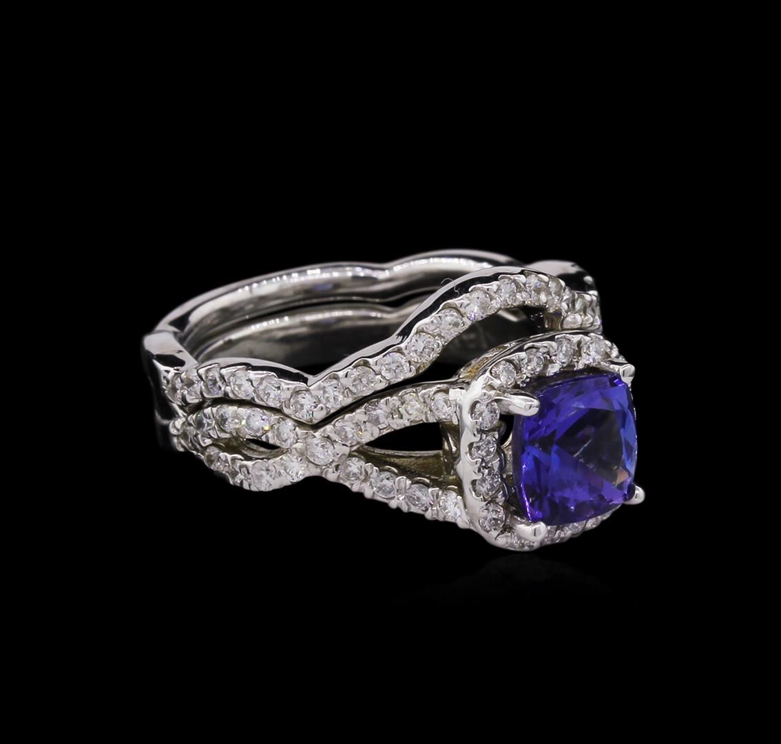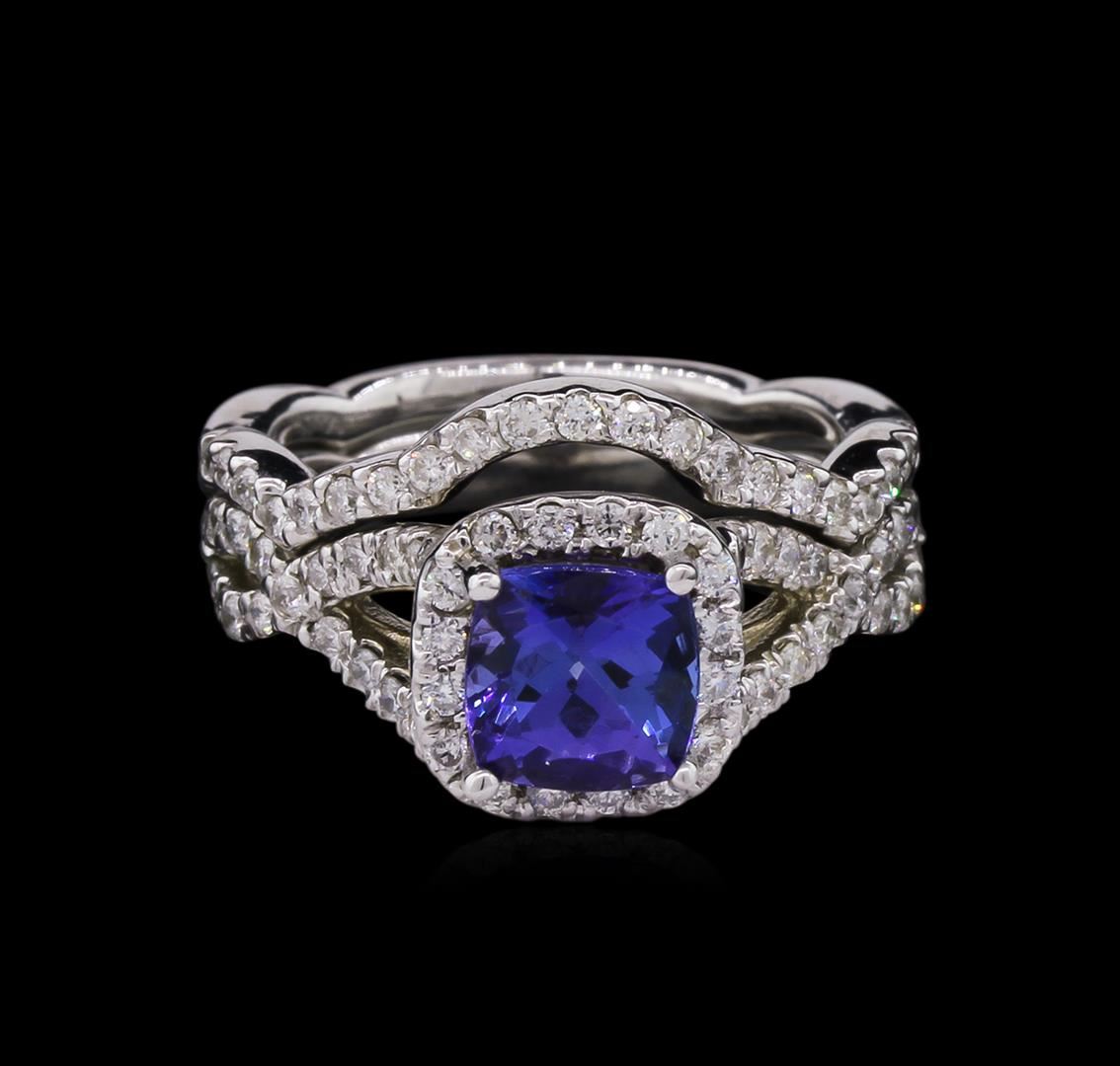 One electronically tested 14KT white gold ladies cast tanzanite and diamond ring and guard with a bright polish finish. Identified with markings of "14K". Condition is new. Containing: One prong set square cushion modified brilliant cut natural tanzanite, measuring 6.20 x 6.20 x 4.03mm, approximate weight of 1.22ct., clarity is eye clean, type I, medium light, very slightly grayish, violet color, (GIA V 4/3), cut is good. Seventy-Seven prong set round brilliant cut diamonds, measuring 1.30 - 1.30 x 0.78mm (depth est.) approximate total weight of 77 Stones = 0.62ct. Clarity: I-1 to I-2. Color: I - J, Cut is Good. Colored gemstones are presumed to have been subjected to commonly used enhancement processes. All diamonds and colored gemstones are graded in the mounting, unless otherwise stated. Total Weight of Colored Stones 1.22ct. Total Weight of Diamonds 0.62ct. Total Weight of Ring And Guard 7.40 grams. GGL Appraised at $4,775.00.