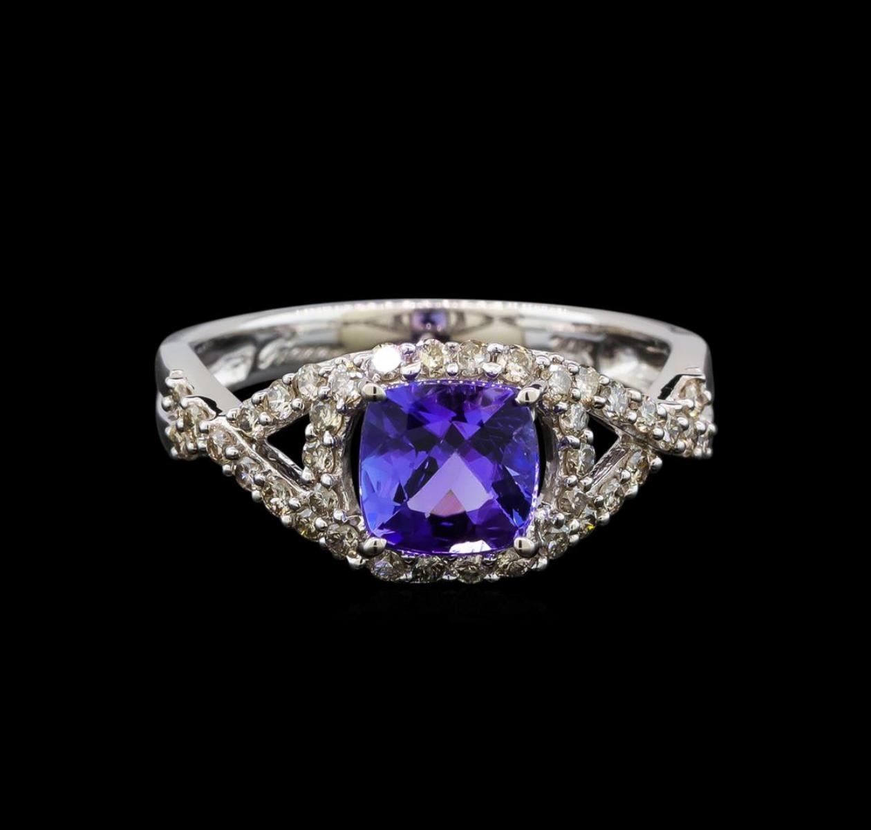 One electronically tested 14KT white gold ladies cast tanzanite and diamond ring with a bright polish finish. Identified with markings of "14K". Condition is new. Containing: One prong set square cushion modified brilliant cut natural tanzanite, measuring 6.20 x 6.20 x 4.03mm, approximate weight of 1.22ct., clarity is eye clean, type I, medium light, very slightly grayish, violet color, (GIA V 4/3), cut is good. Thirty-Six prong set round brilliant cut diamonds, measuring 1.20 - 1.20 x 0.72mm (depth est.) approximate total weight of 36 Stones = 0.23ct. Clarity: SI-2 to I-2. Color: I - J. All diamonds and colored gemstones are graded in the mounting, unless otherwise stated. Colored gemstones are presumed to have been subjected to commonly used enhancement processes. Total Weight of Colored Stones 1.22ct. Total Weight of Diamonds 0.23ct. Total Weight of Ring 3.30 grams. GGL Appraised.