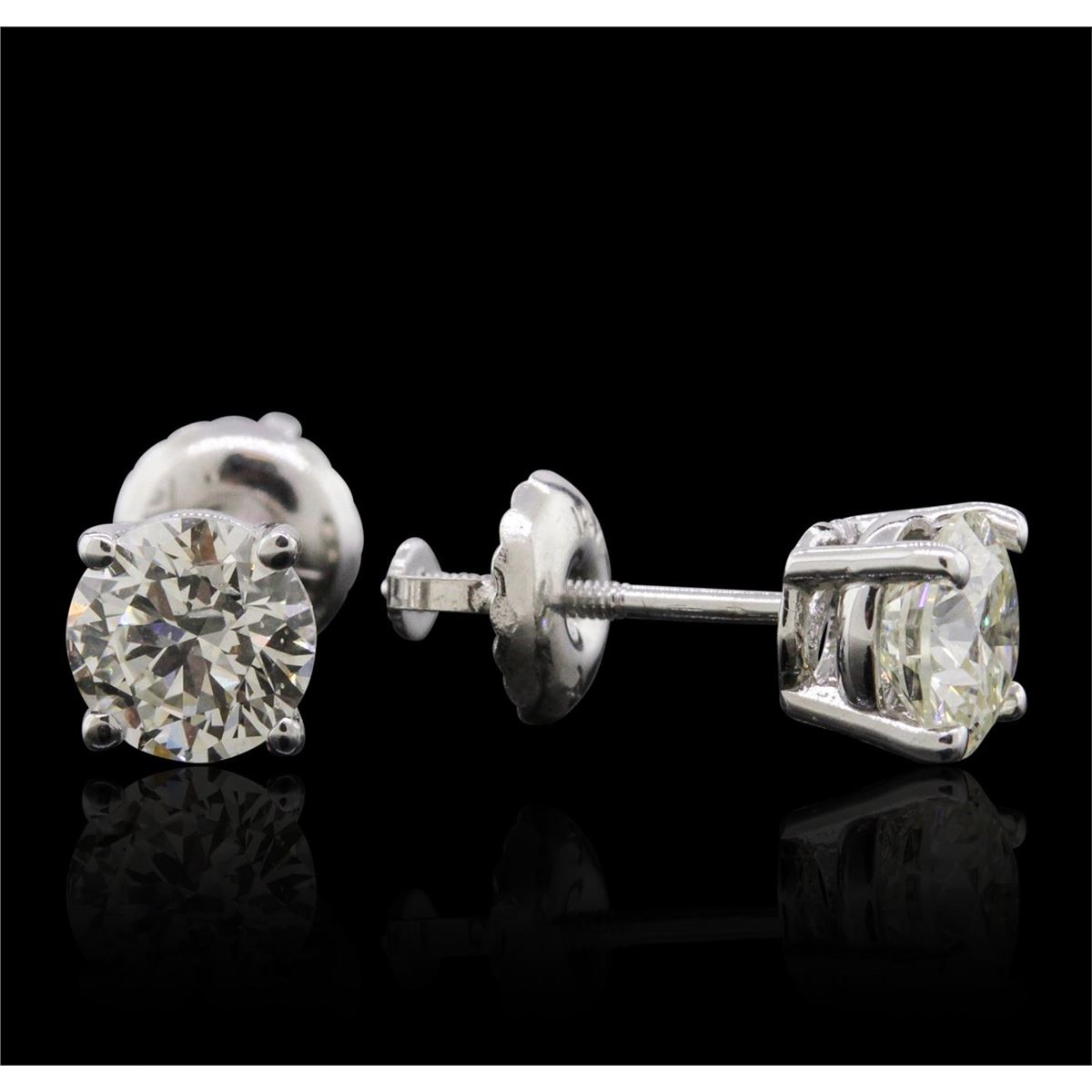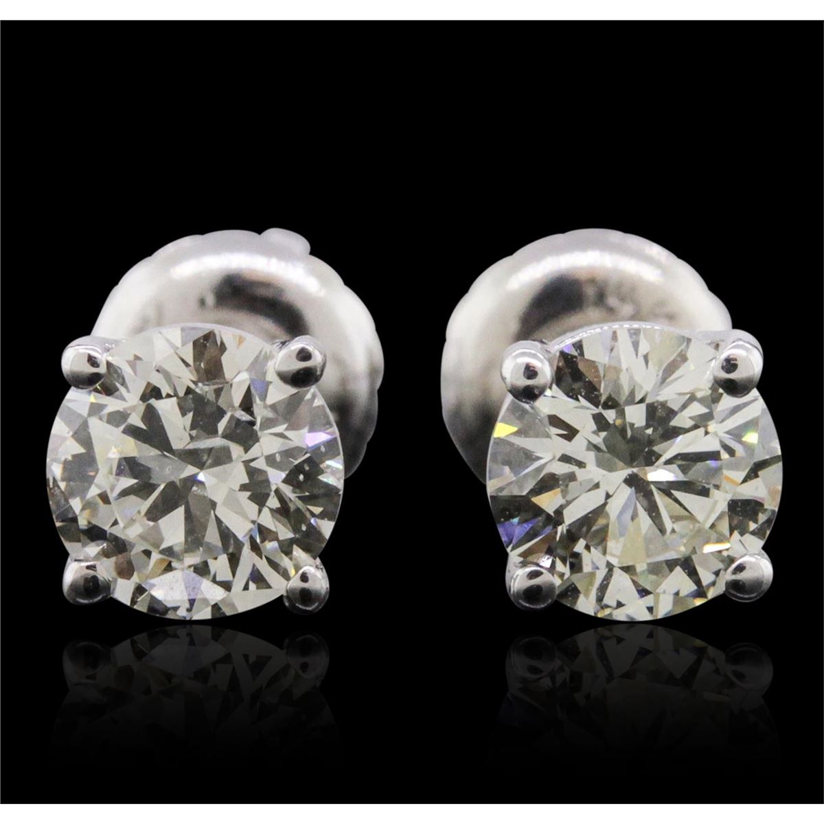 One pair electronically tested 14KT white gold cast & assembled diamond solitaire earrings with standard backs. Bright polish finish. Condition is new, good workmanship. Containing: One prong set round brilliant cut diamond, measuring 5.12 - 5.10 x 3.07mm (depth est.), 3.00% GTCF approximate weight of 0.60ct with a faint blue fluorescence. Graded in the setting. Clarity: SI-2. Color: 60.1%. Table 58.7%. One prong set round brilliant cut diamond, measuring 5.10 - 5.09 x 3.20mm (depth est.), 3.00% GTCF approximate weight of 0.62ct with a medium blue fluorescence. Graded in the setting. Clarity: I-1. Color: 62.8%. Table 60.8%. Total Weight of Diamonds 1.22ct. Total Weight of Earrings 0.96 grams. AIG Appraised at $4,660.00.
