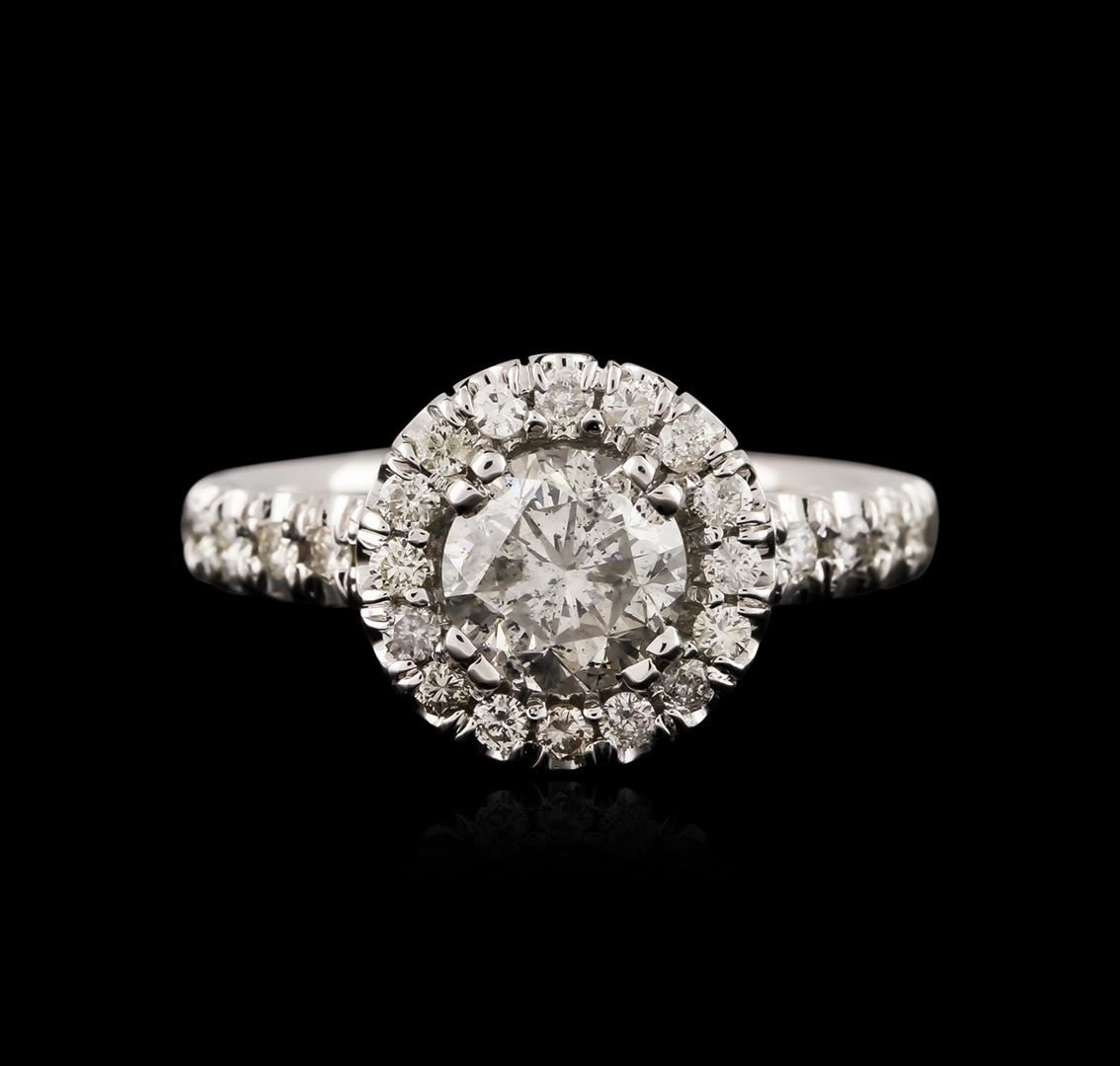 One electronically tested 14KT white gold ladies cast diamond engagement ring with a bright polish finish. Identified with markings of "14K". Condition is very good. Containing: One prong set round brilliant cut diamond, measuring 6.50 - 6.50 x 3.90mm (depth est.) approximate weight of 1.01ct. Clarity: I-2. Color: J, Cut is Good. Twenty-Eight prong set round brilliant cut diamonds, measuring 1.30 - 1.30 x 0.78mm (depth est.) approximate total weight of 28 Stones = 0.22ct. Clarity: SI-2 to I-1. Color: I - J. All diamonds are graded in the mounting, unless otherwise stated. Total Weight of Diamonds 1.23ct. Total Weight of Engagement Ring 5.10 grams. GGL Appraised at $6,000.00.
