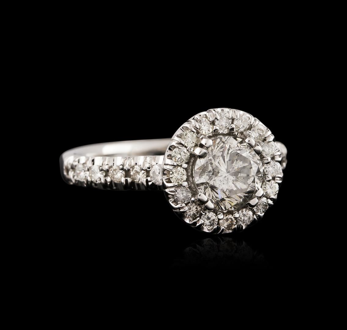 One electronically tested 14KT white gold ladies cast diamond engagement ring with a bright polish finish. Identified with markings of "14K". Condition is very good. Containing: One prong set round brilliant cut diamond, measuring 6.50 - 6.50 x 3.90mm (depth est.) approximate weight of 1.01ct. Clarity: I-2. Color: J, Cut is Good. Twenty-Eight prong set round brilliant cut diamonds, measuring 1.30 - 1.30 x 0.78mm (depth est.) approximate total weight of 28 Stones = 0.22ct. Clarity: SI-2 to I-1. Color: I - J. All diamonds are graded in the mounting, unless otherwise stated. Total Weight of Diamonds 1.23ct. Total Weight of Engagement Ring 5.10 grams. GGL Appraised at $6,000.00.
