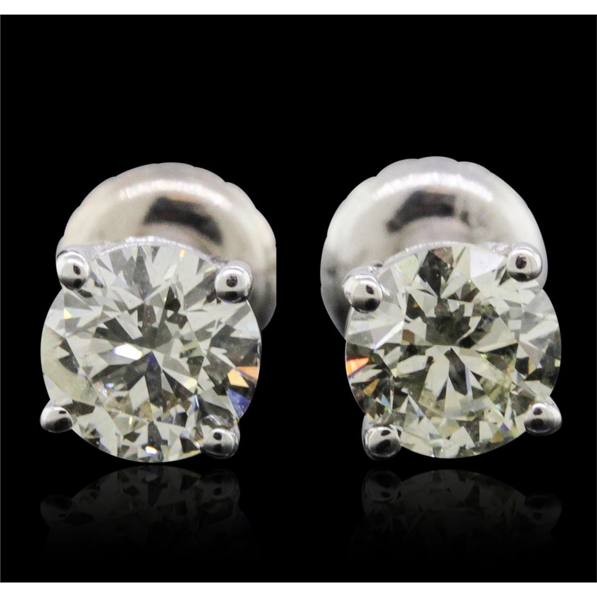 One pair electronically tested 14KT white gold cast & assembled diamond solitaire earrings with screw backs. Bright polish finish. Condition is new, good workmanship. Containing: One prong set round brilliant cut diamond, measuring 5.08 - 5.06 x 3.25mm (depth est.), 4.00% GTCF approximate weight of 0.63ct with a medium blue fluorescence. Graded in the setting. Clarity: I-1. Depth: 64.1%. Table 56.2%. One prong set round brilliant cut diamond, measuring 5.01 - 5.00 x 3.15mm (depth est.), 4.00% GTCF approximate weight of 0.60ct with a medium blue fluorescence. Graded in the setting. Clarity: I-1. Depth: 62.9%. Table 57.9%. Total Weight of Diamonds 1.23ct. Total Weight of Earrings 0.92 grams. AIG Appraised at $3,990.00.