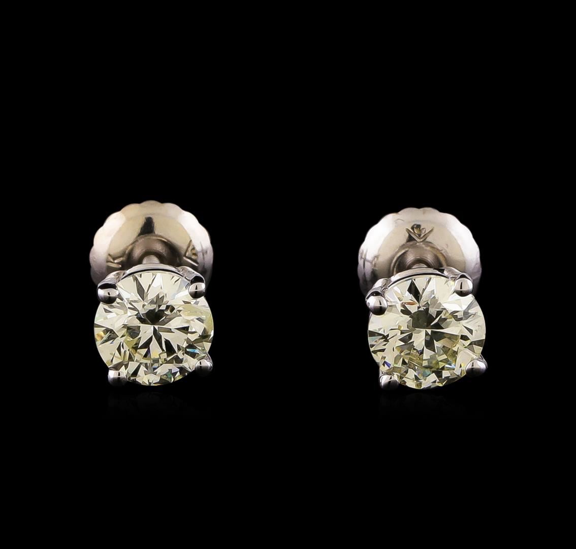 One pair electronically tested 14KT white gold cast & assembled diamond solitaire earrings with screw backs. Bright polish finish. Condition is new, good workmanship. Containing: One prong set round brilliant cut diamond, measuring 5.08 - 5.06 x 3.25mm (depth est.), 4.00% GTCF approximate weight of 0.63ct with a medium blue fluorescence. Graded in the setting. Clarity: I-1. Depth: 64.1%. Table 56.2%. One prong set round brilliant cut diamond, measuring 5.01 - 5.00 x 3.15mm (depth est.), 4.00% GTCF approximate weight of 0.60ct with a medium blue fluorescence. Graded in the setting. Clarity: I-1. Depth: 62.9%. Table 57.9%. Total Weight of Diamonds 1.23ct. Total Weight of Earrings 0.92 grams. AIG Appraised at $3,990.00.