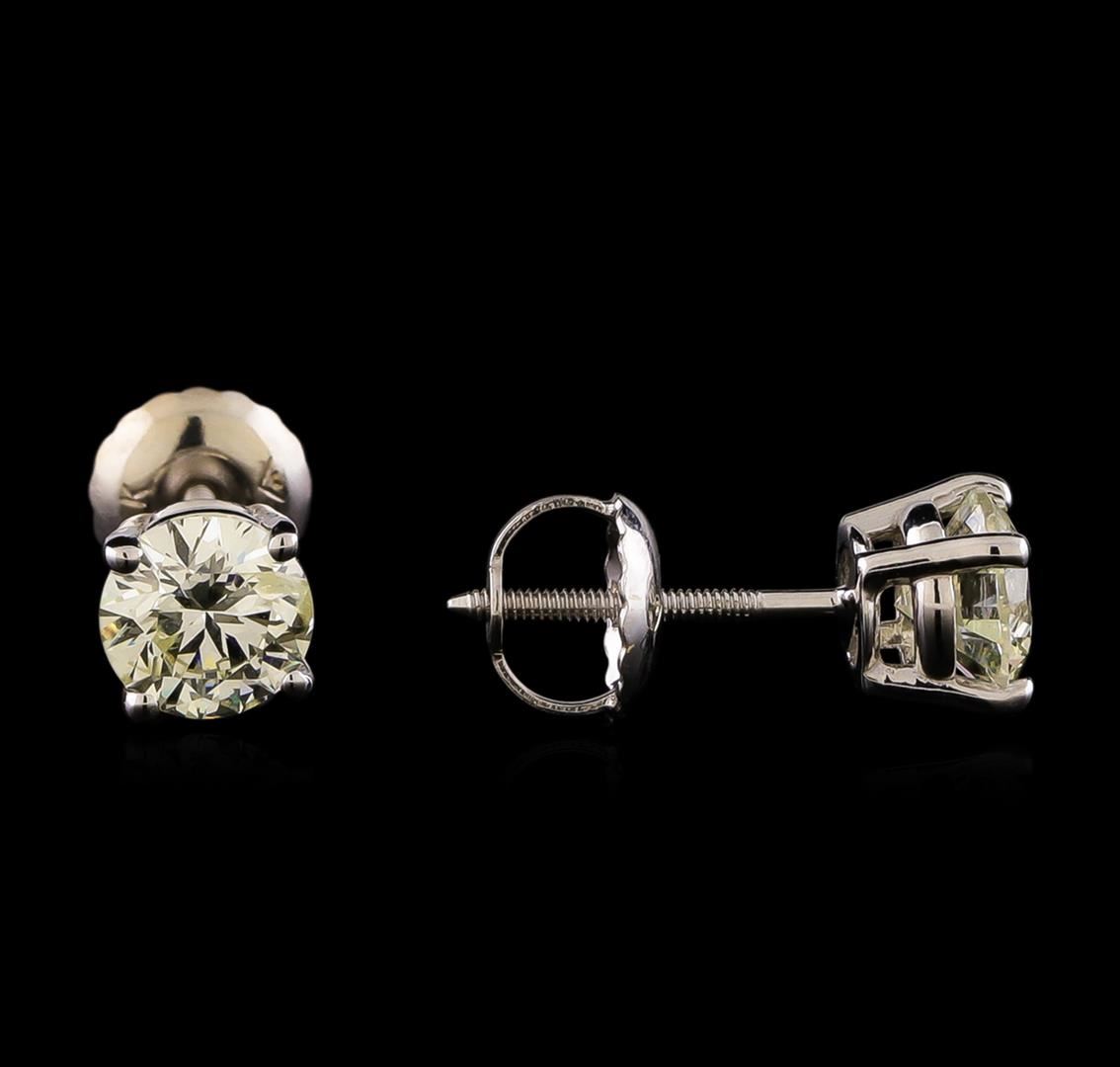 One pair electronically tested 14KT white gold cast & assembled diamond solitaire earrings with screw backs. Bright polish finish. Condition is new, good workmanship. Containing: One prong set round brilliant cut diamond, measuring 5.08 - 5.06 x 3.25mm (depth est.), 4.00% GTCF approximate weight of 0.63ct with a medium blue fluorescence. Graded in the setting. Clarity: I-1. Depth: 64.1%. Table 56.2%. One prong set round brilliant cut diamond, measuring 5.01 - 5.00 x 3.15mm (depth est.), 4.00% GTCF approximate weight of 0.60ct with a medium blue fluorescence. Graded in the setting. Clarity: I-1. Depth: 62.9%. Table 57.9%. Total Weight of Diamonds 1.23ct. Total Weight of Earrings 0.92 grams. AIG Appraised at $3,990.00.