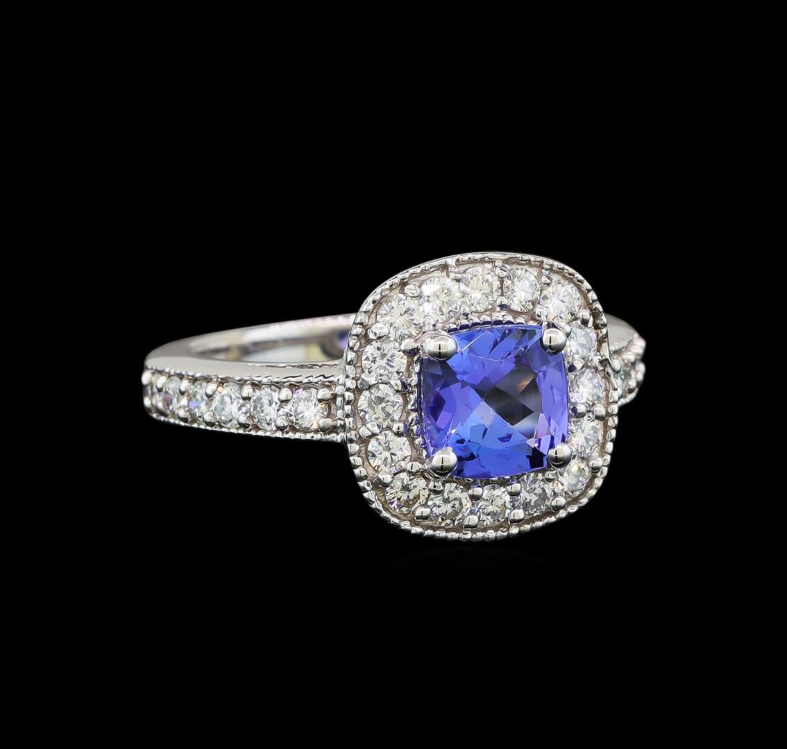 One electronically tested 14KT white gold ladies cast tanzanite and diamond ring with a bright polish finish. Identified with markings of "14K". Condition is new. Containing: One prong set square cushion modified brilliant cut natural tanzanite, measuring 6.50 x 6.50 x 4.23mm, approximate weight of 1.23ct., clarity is eye clean, type I, medium, moderately strong, violet color, (GIA V 5/4), cut is good. Twenty-Eight prong set round brilliant cut diamonds, measuring 1.60 - 1.60 x 0.96mm (depth est.) approximate total weight of 28 Stones = 0.52ct. Clarity: SI-1 to SI-2. Color: I - J, Cut is Good. Colored gemstones are presumed to have been subjected to commonly used enhancement processes. All diamonds and colored gemstones are graded in the mounting, unless otherwise stated. Total Weight of Colored Stones 1.23ct. Total Weight of Diamonds 0.52ct. Total Weight of Ring 5.80 grams. GGL Appraised at $3,530.00.